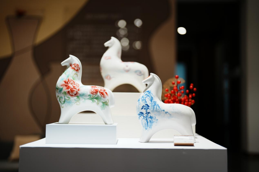 在它的身边,是陶瓷艺术家们以“马”为主题,创作的陶瓷雕塑、陶瓷彩绘和贺岁日用瓷等产品。