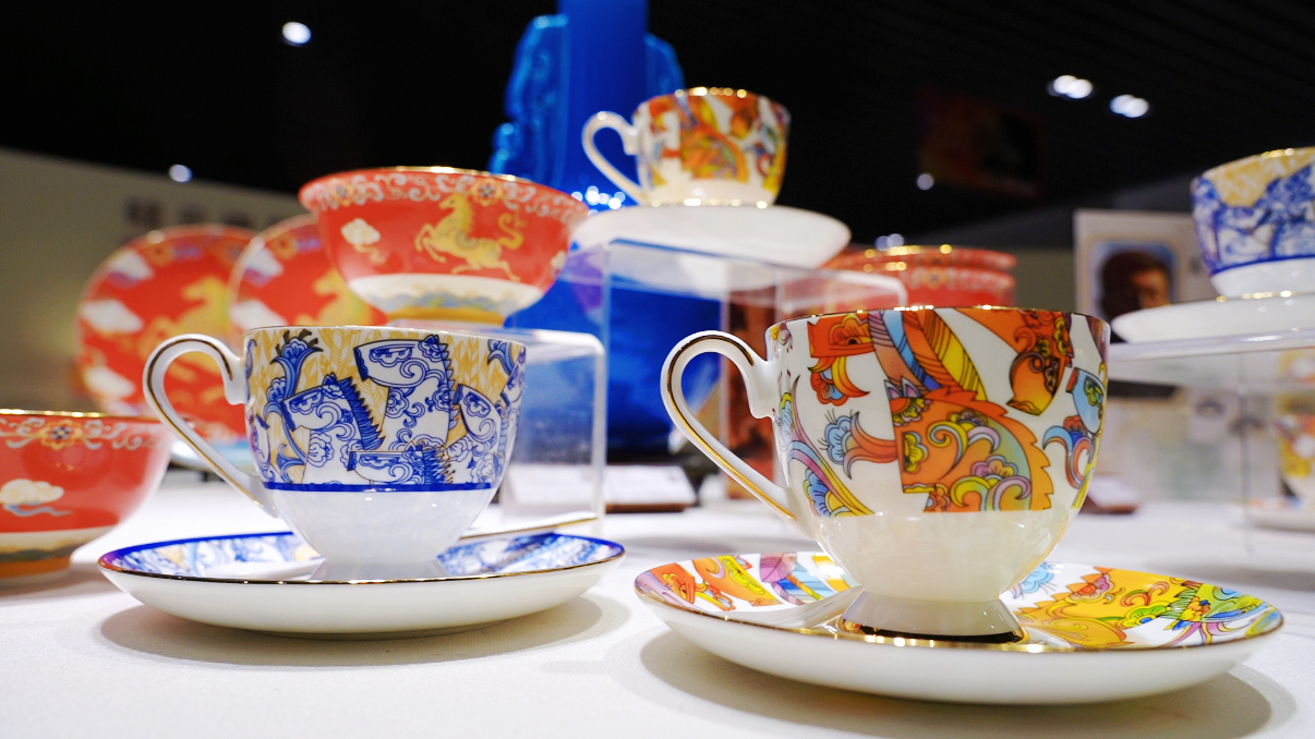 一众作品中,一组青花瑞马瓷杯以时尚亮眼的风格也吸引众人眼球。马克杯的形态之上,杯身与杯碟上的青花线条洒脱灵动,马纹形态与卷草纹、云纹相互交融。