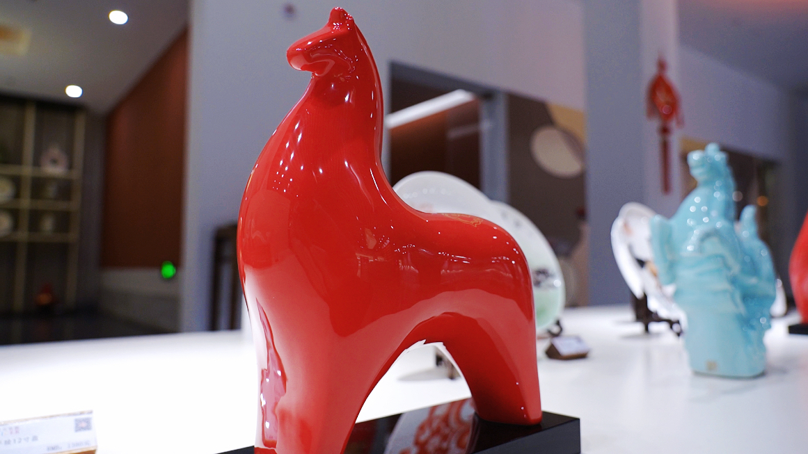 “比如说,这一雕塑就是以写意手法,捕捉了骏马瞬间翻腾的状态,加以釉色,让作品呈现不同的生动状态。”顺着毛晓东手指的方向,一匹英姿勃发的红色骏马,牢牢占据着展厅中的“C位”。