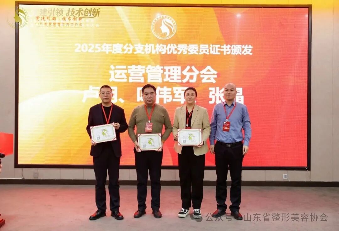 曹京敏会长为2025年度优秀分支机构:运营管理分会、私密整形分会、皮肤美容分会、文饰分会颁发证书。