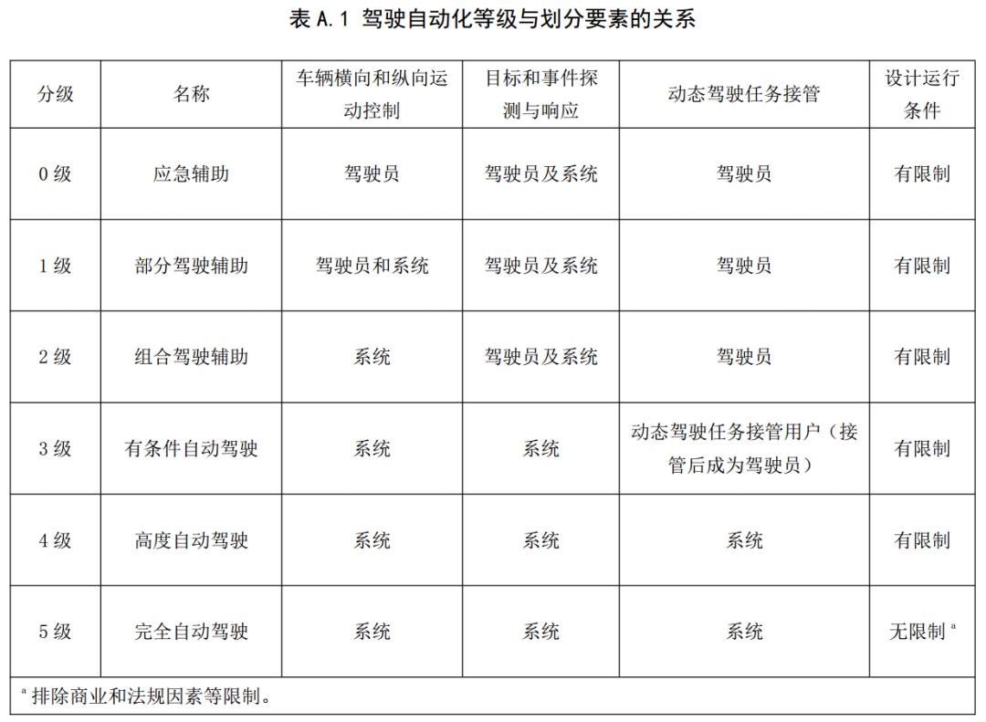 根据我国《汽车驾驶自动化分级》,驾驶自动化分成0级至5级共六个等级: