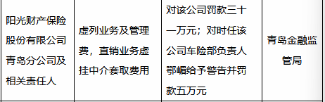 日前,国家金融监督管理总局青岛监管局公布行政处罚决定,阳光财产保险股份有限公司青岛分公司因虚列业务及管理费、直销业务虚挂中介套取费用,被处以31万元罚款。时任该公司车险部负责人鄂某同时被警告并罚款5万元。
