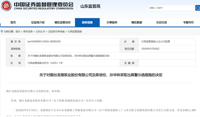 1月6日,证监会山东监管局官网公示的行政监管措施决定书显示,烟台龙港泵业股份有限公司及陈培伦、孙华林因两项违法违规被采取出具警示函的行政监管措施。