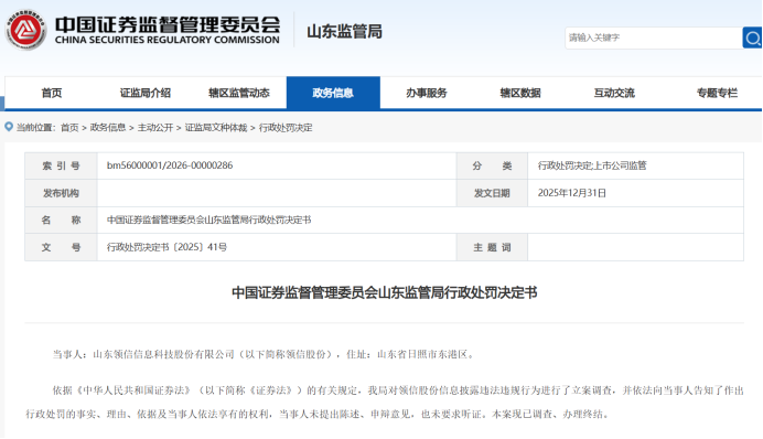 1月8日,证监会山东监管局官网披露的行政处罚决定书(〔2025〕41号)显示,山东领信信息科技股份有限公司因为虚增收入、利润、信披违法违规被山东证监局警告并罚款700万元。同时,时任董事长及实际控制人李鹏,时任董事、副总经理、董事会秘书王宗辉一并领罚。