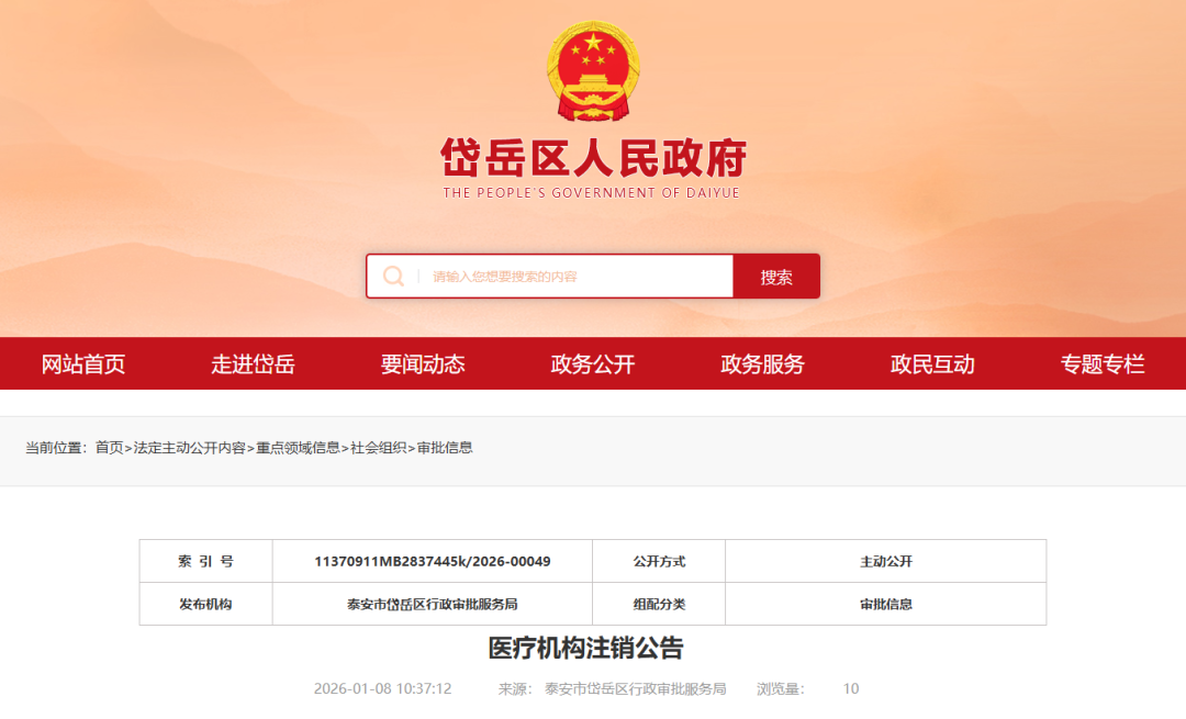 1月8日,岱岳区人民政府网站发布医疗注销公告,具体内容如下: