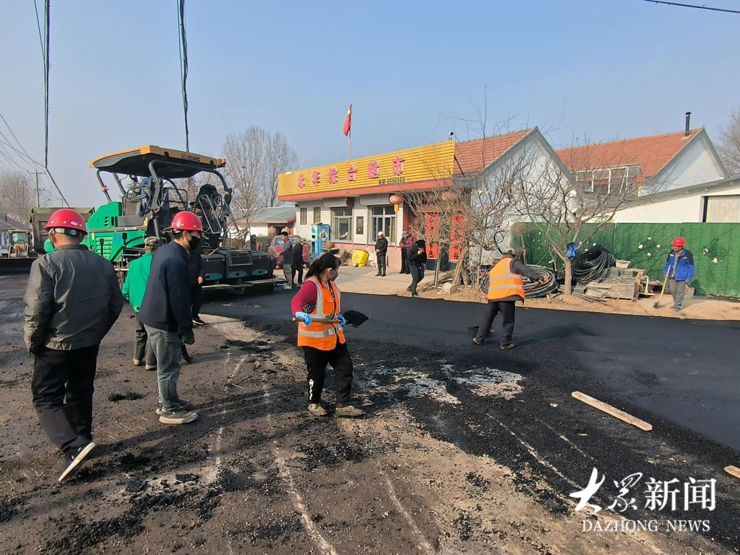 东山坡村村头,人们正在给道路重铺沥青。