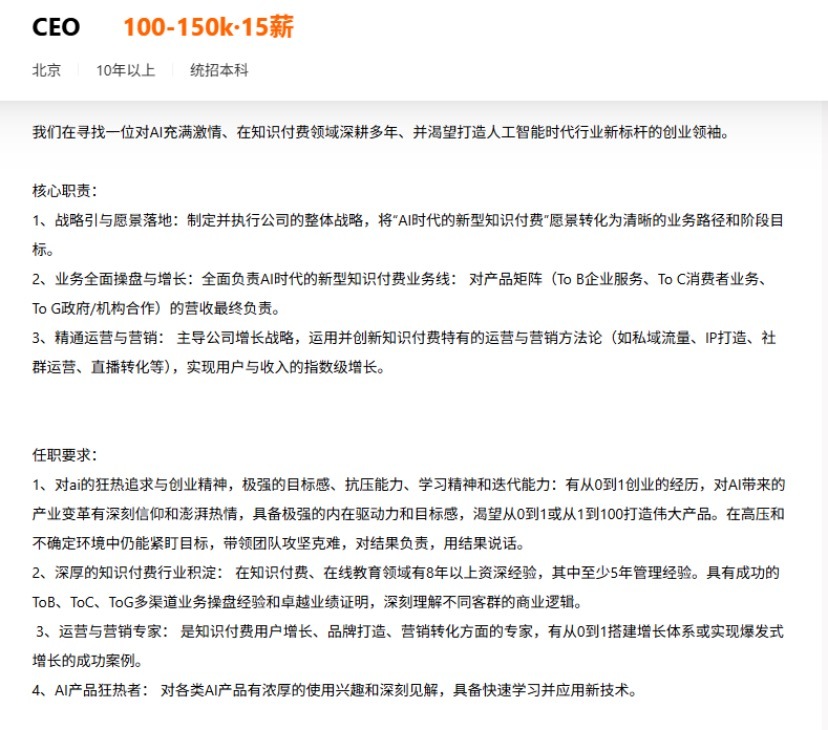 以某家致力于用AI重塑知识付费赛道的创业公司为例,他们在猎聘平台寻访一位CEO,职位年薪高达150万至225万元,要求候选人拥有的关键能力即必须对AI技术拥有“狂热信仰”,并能将其转化为颠覆性的商业战略。