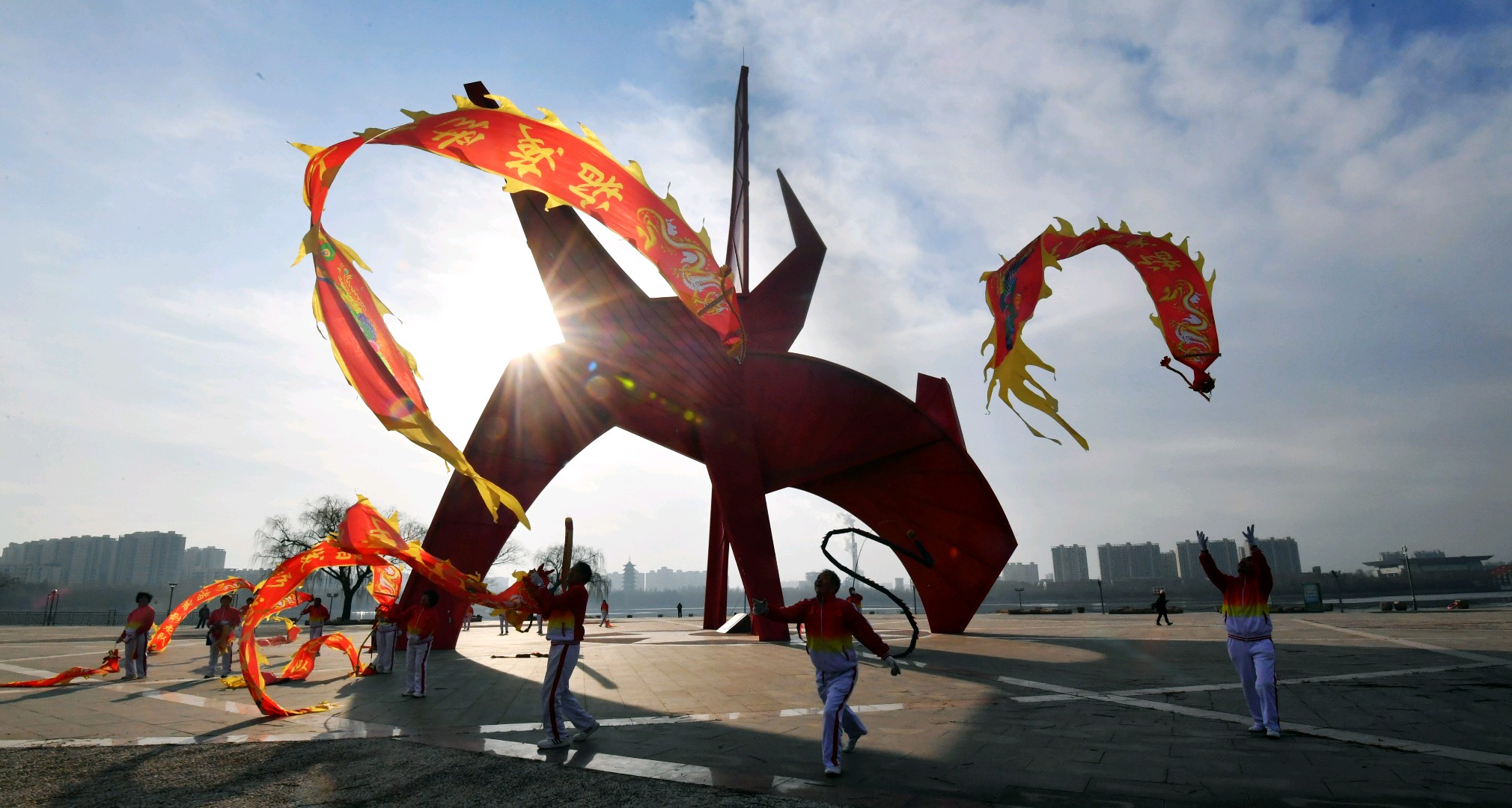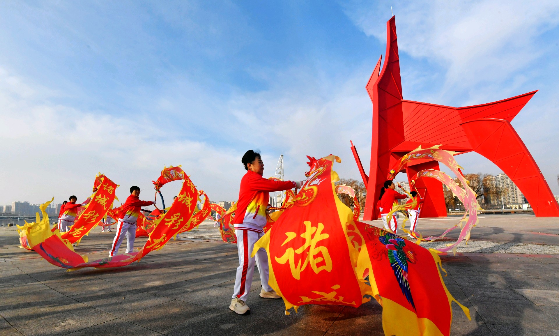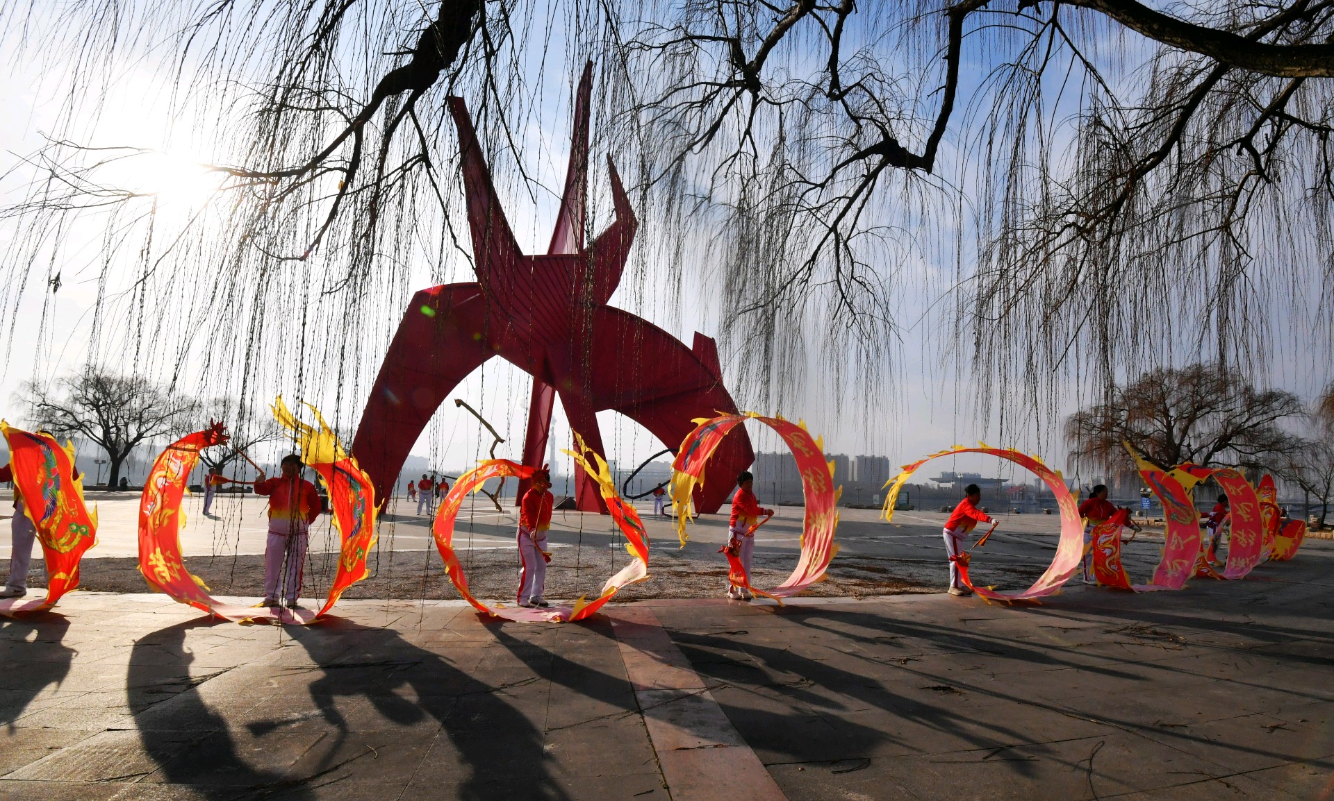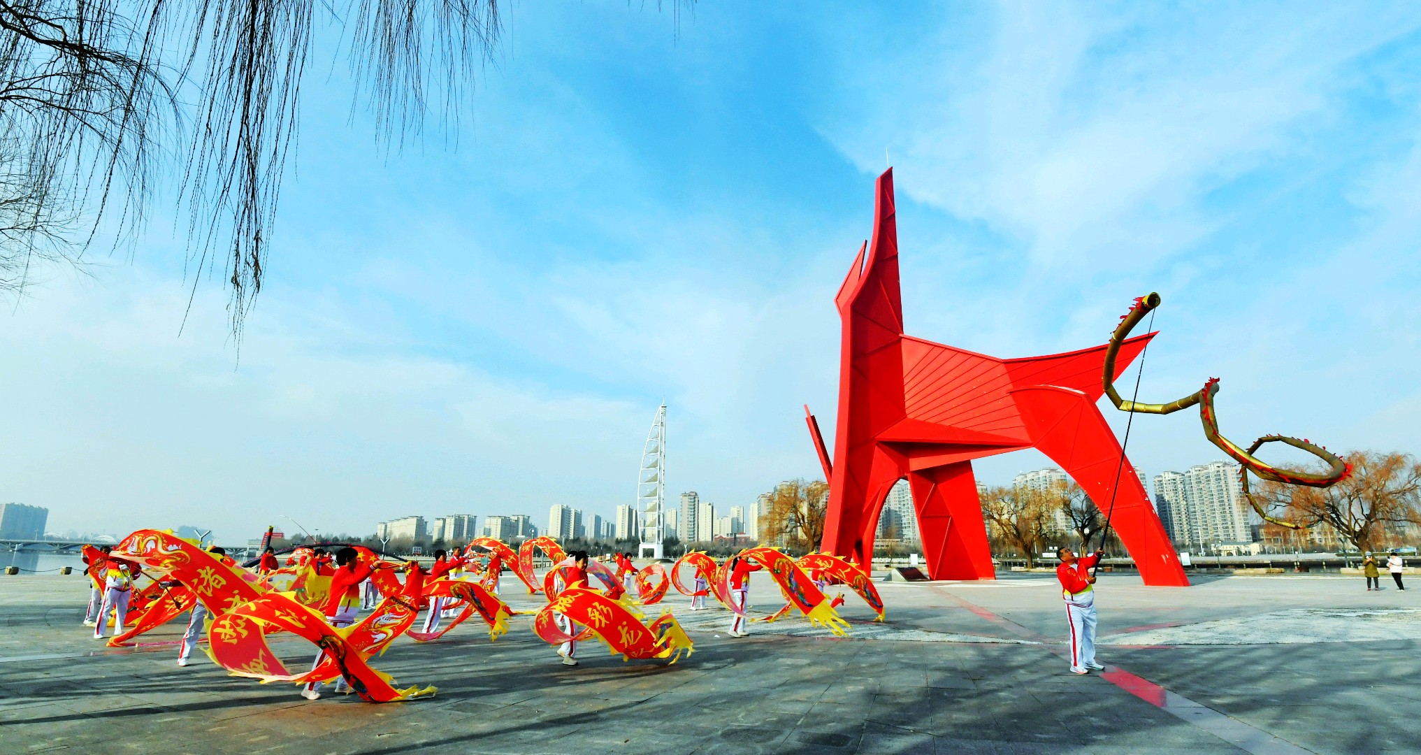 金鳞熤熤,巨龙凌空腾跃,撼动心魄。1月9日上午,潍坊诸城市彩龙队迎新年文艺表演在潍河公园龙韵雕塑下精彩上演。