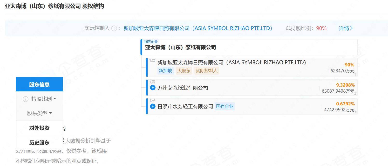股权方面,企查查显示,新加坡亚太森博日照有限公司(ASIA SYMBOL RIZHAO PTE.LTD)(下称“新加坡亚太森博日照”)持有亚太森博90%股权,为公司大股东;苏州艾森纸业有限公司和日照市水务轻工有限公司分别持有公司9.32%、0.68%的股权。