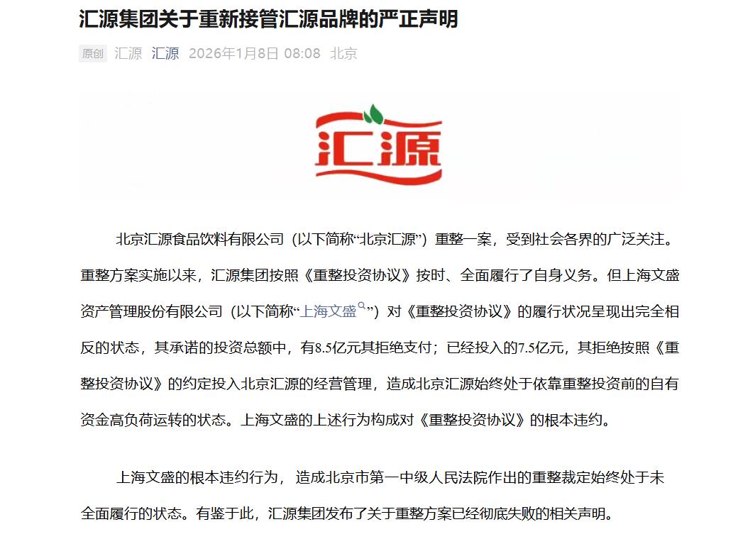 1月8日,北京汇源原股东汇源集团发布声明,宣布重新接管汇源品牌。声明指出,重整投资人上海文盛资产管理股份有限公司(以下简称“上海文盛”)未履行《重整投资协议》约定,其承诺的投资总额中,有8.5亿元其拒绝支付;已经投入的7.5亿元,其拒绝按照《重整投资协议》的约定投入北京汇源的经营管理,造成北京汇源始终处于依靠重整投资前的自有资金高负荷运转的状态。上海文盛的上述行为构成对《重整投资协议》的根本违约。