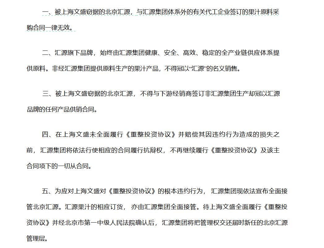 汇源集团称,上海文盛的根本违约行为,造成北京市第一中级人民法院作出的重整裁定始终处于未全面履行的状态。有鉴于此,汇源集团发布了关于重整方案已经彻底失败的相关声明。为应对上海文盛对《重整投资协议》的根本违约行为, 汇源集团现依法宣布全面接管北京汇源。汇源果汁的相应订货, 亦由汇源集团全面接管。待上海文盛全面履行《重整投资协议》并经北京市第一中级人民法院确认后, 汇源集团将把管理权交还届时新任的北京汇源管理层。