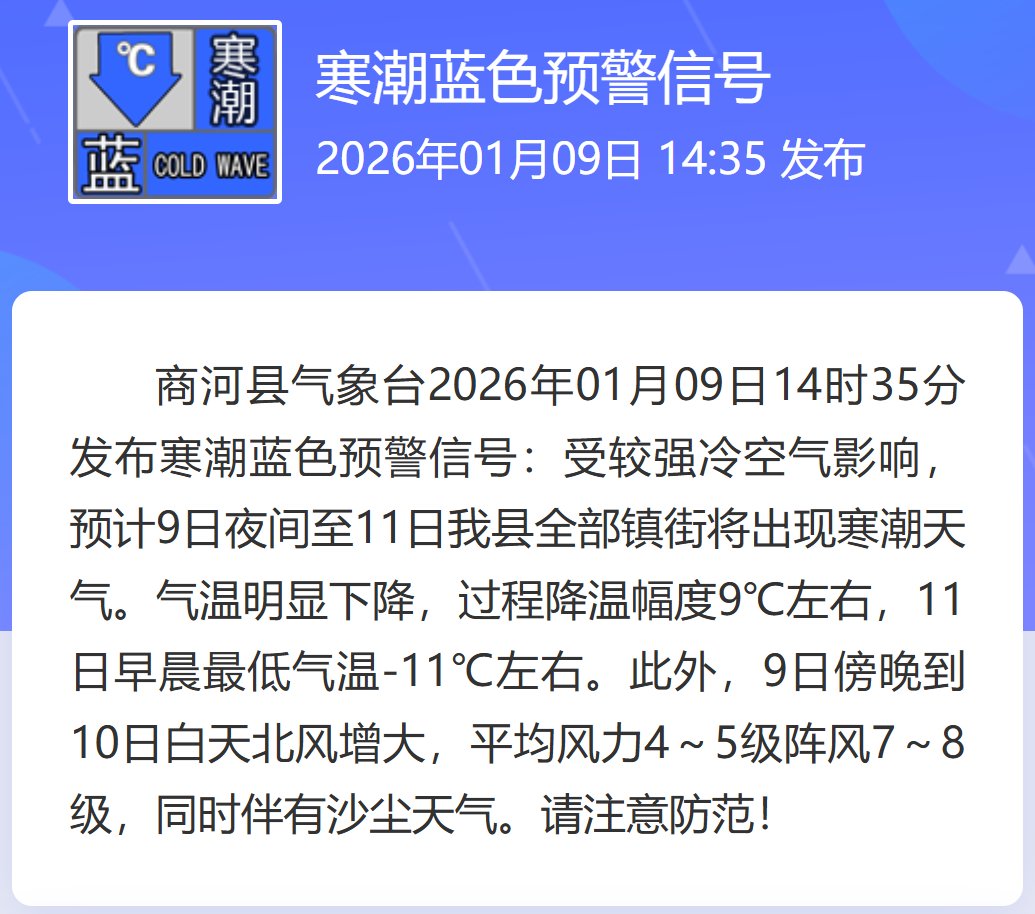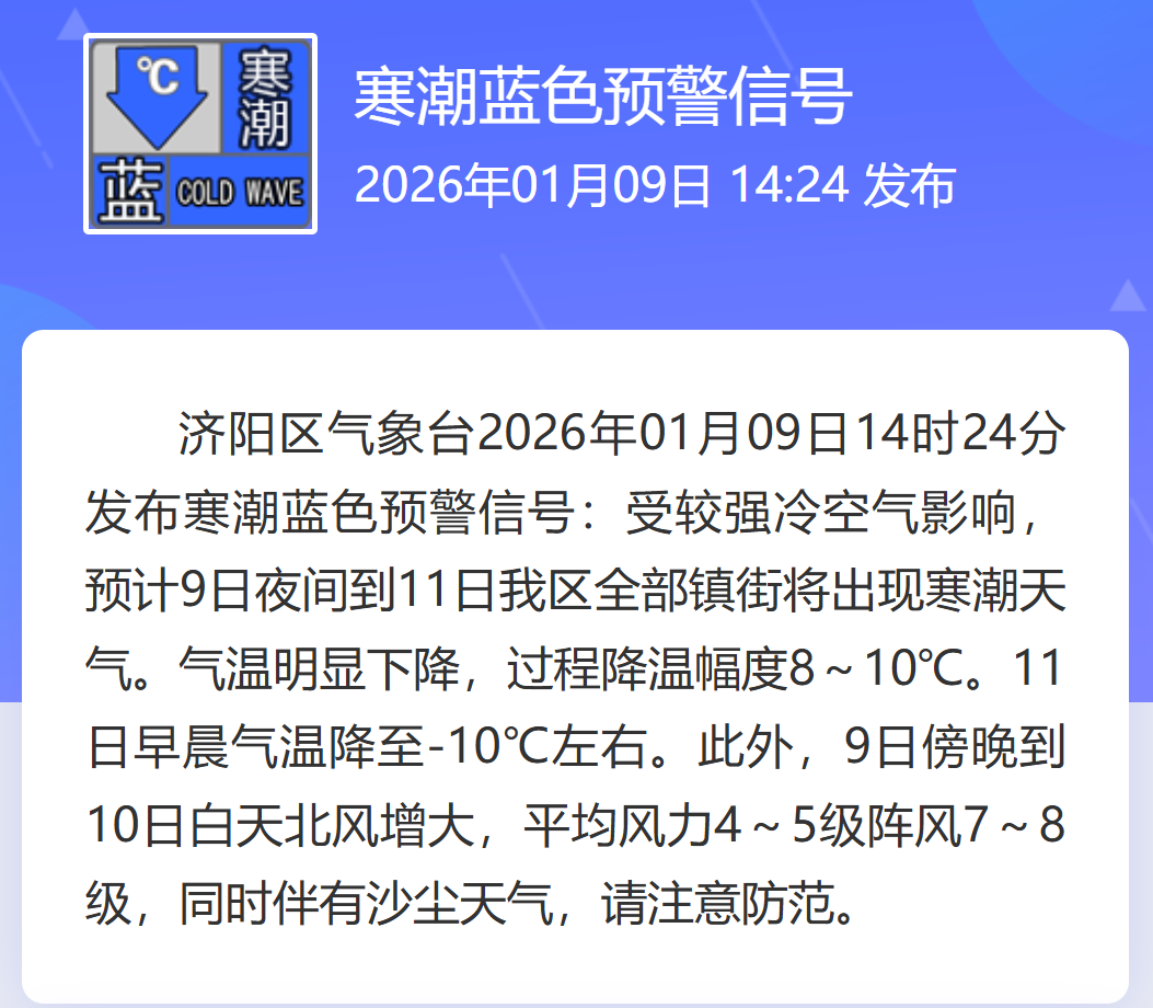 济南市气象台2026年1月9日14时15分发布寒潮蓝色预警信号: