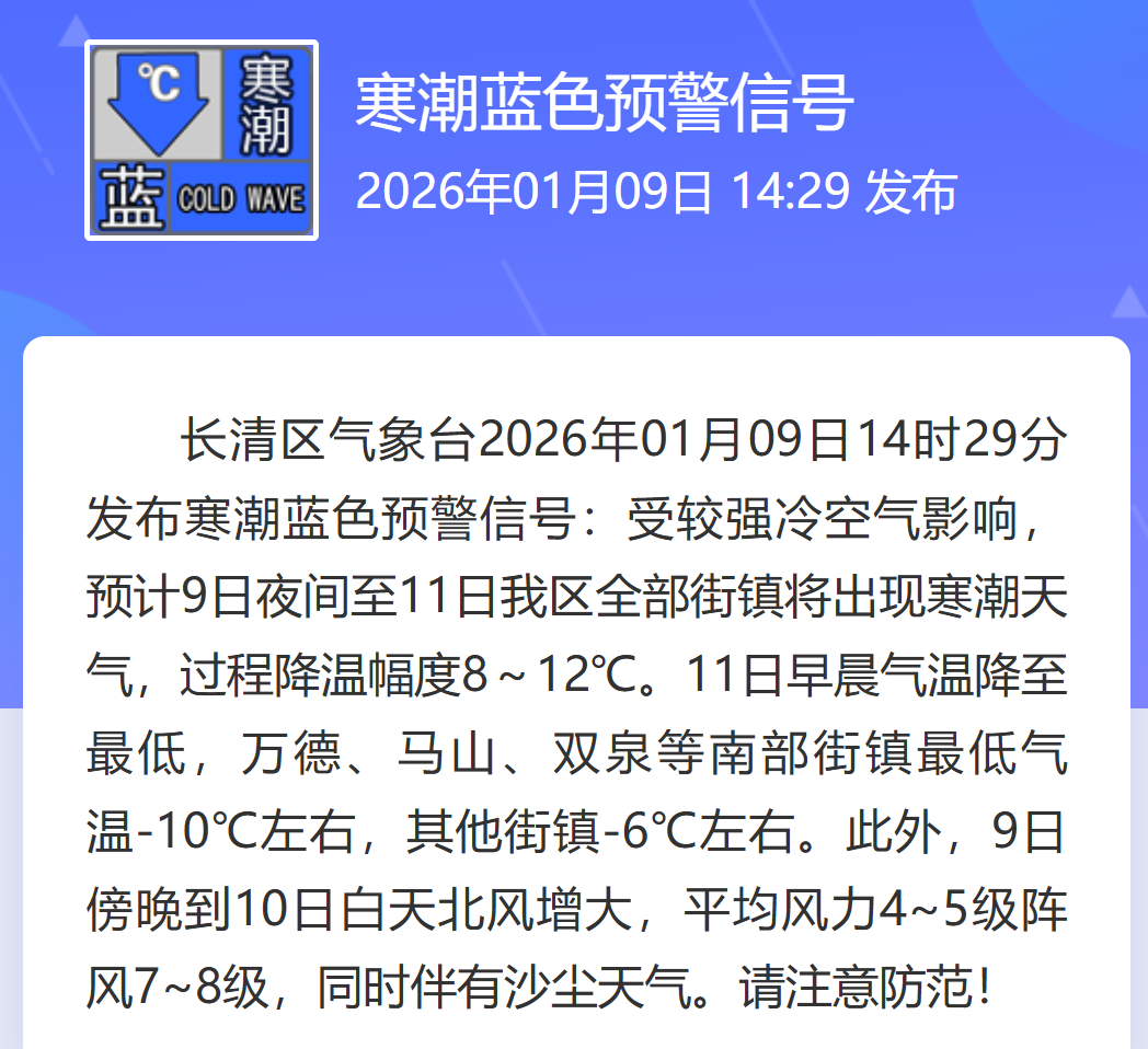 随后,济阳区、长清区、商河县、章丘区气象台也发布寒潮蓝色预警,请注意防范。