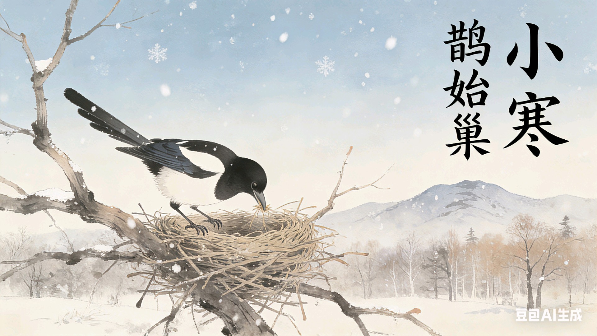 此景恰是唐元稹笔下“欢鹊垒新巢”的生动写照,正合小寒节气二候“鹊始巢”之语。也直接印证了寒极之时,万物看似沉寂萧条,大自然的生灵却早已在冰天雪地中感知到天地间的阳气萌动。