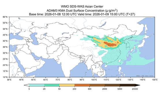 根据最新气象资料,结合沙尘预报模式分析,1月9日济南市持续西南大风(4—6m/s),晚上转西北大风(8m/s),预计9日傍晚前后开始受沙尘传输影响,PM10浓度将迅速上升,小时颗粒物浓度可能达到重度污染及以上水平。10日近地面西北风,风力较强(4—6m/s),随着冷空气持续推进,预计10日中午前沙尘影响趋于结束。