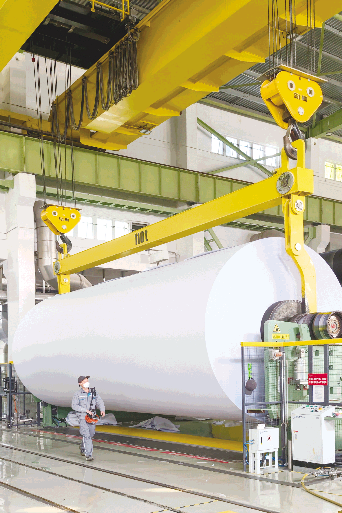 在亚太森博(山东)浆纸有限公司文化纸生产线,行车操作员正在将幅宽8.7米,重60余吨的大纸卷送往复卷工序。(通讯员 刘磊 摄)