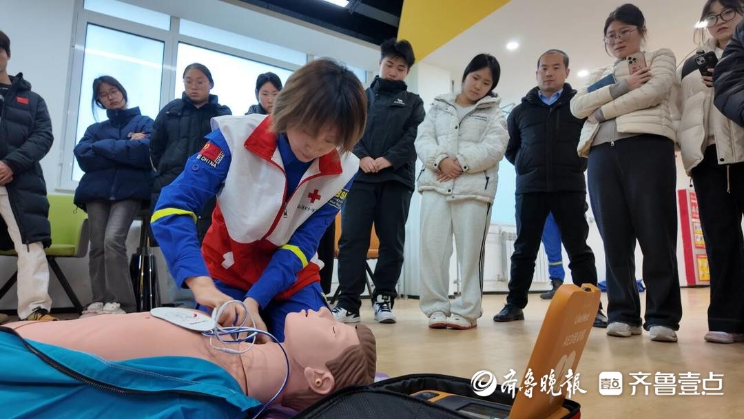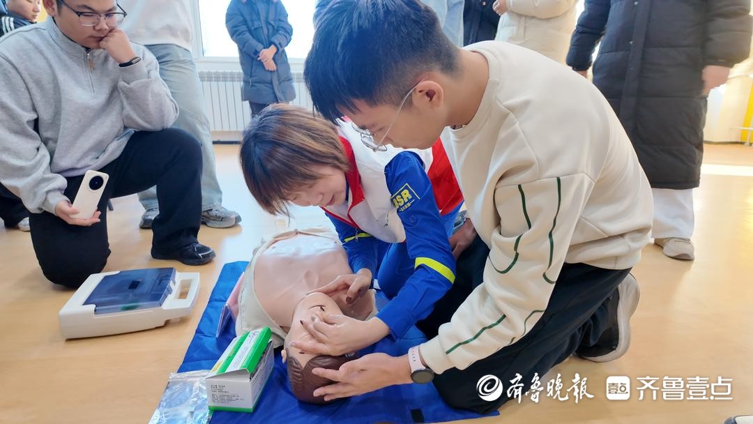 “手指交叉,掌根贴紧胸骨中下段,手臂打直,用身体重心往下压,按压不能图快,确保胸廓完全回弹。”“人工呼吸时,嘴要完全包住,不能过度吹气。”“电极片要贴在患者胸部右上方和左乳头外侧,必须紧贴裸露皮肤,不能被衣物遮挡。”……烟台蓝天救援队的5名教官俯身指导,对学生们操作中手腕发力不稳、按压位置偏移等易忽视细节逐一纠正。