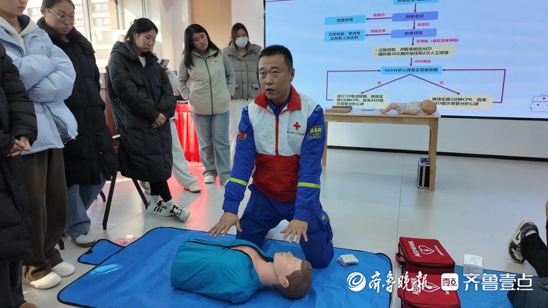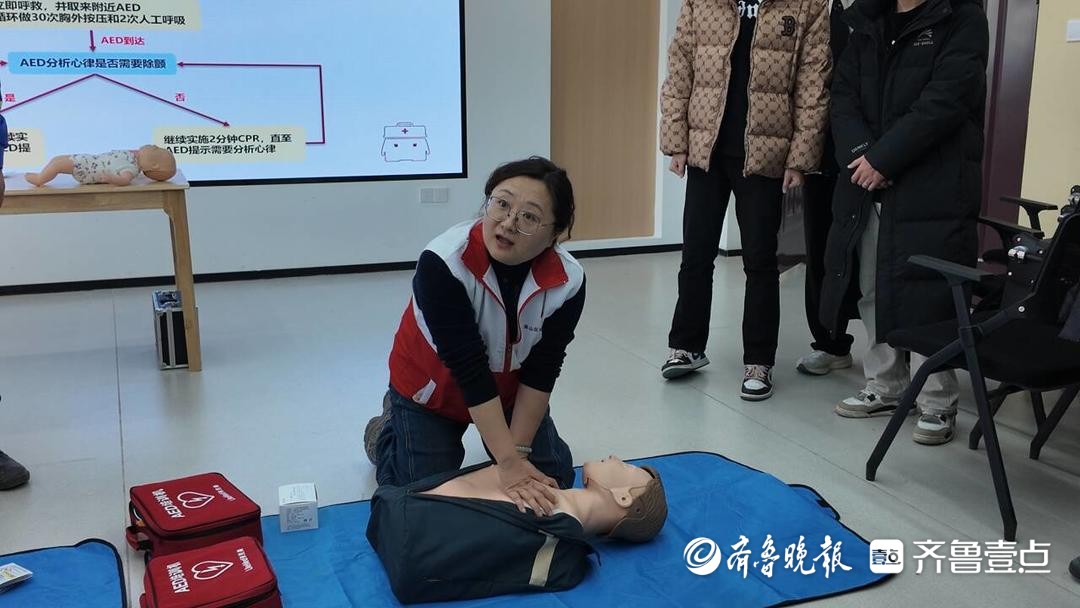只见,烟台蓝天救援队培训部老师杲丹手持教学模型,精准拆解心肺复苏的每一个关键动作,从判断意识、呼救求助的前期准备,到胸外按压的力度控制、人工呼吸的气道开放技巧,再到AED设备的电极片粘贴、语音提示响应等操作,每个环节都讲解得细致入微。