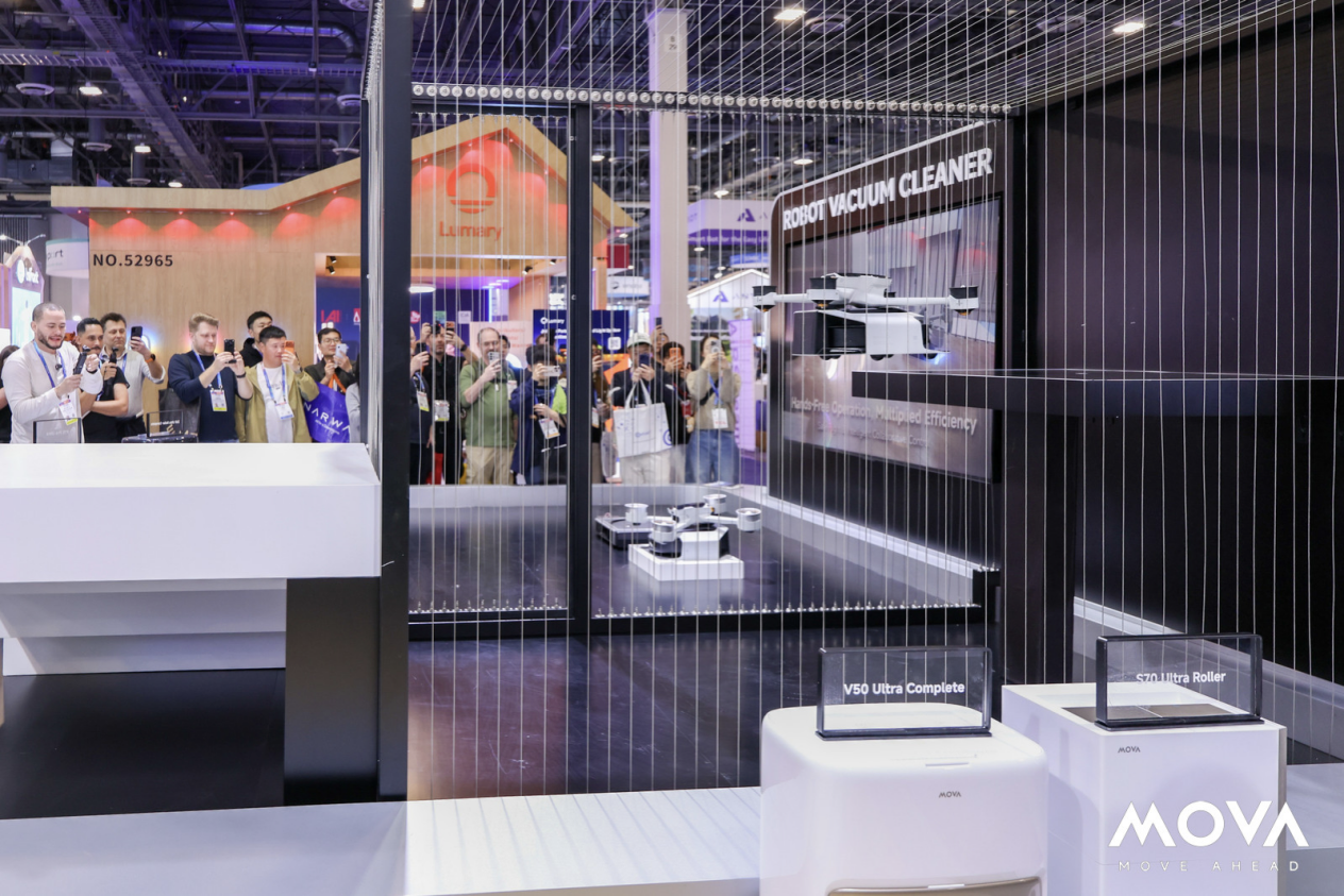 走进CES MOVA展台始终人头攒动,一进来就能感受到一种迥异于传统家电展台的磁场。人群密集簇拥在几个动态演示区,其中首当其冲的就属MOVA Pilot 70飞行模组,在这里无人机稳稳吊起扫地机器人,缓缓升空,落在模拟家中二楼或楼顶的平台上。