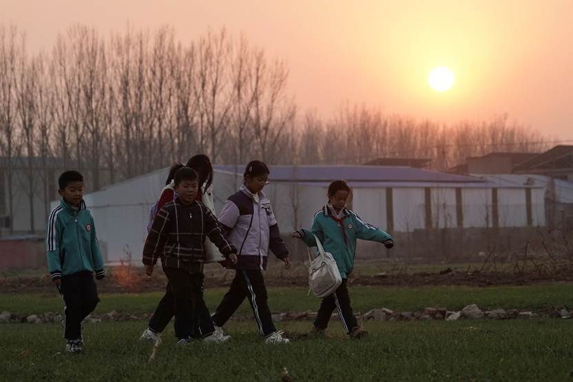 ▲夕阳西下,杭头村的孩子们放学了约着去图书馆看书。胡弘彪/摄