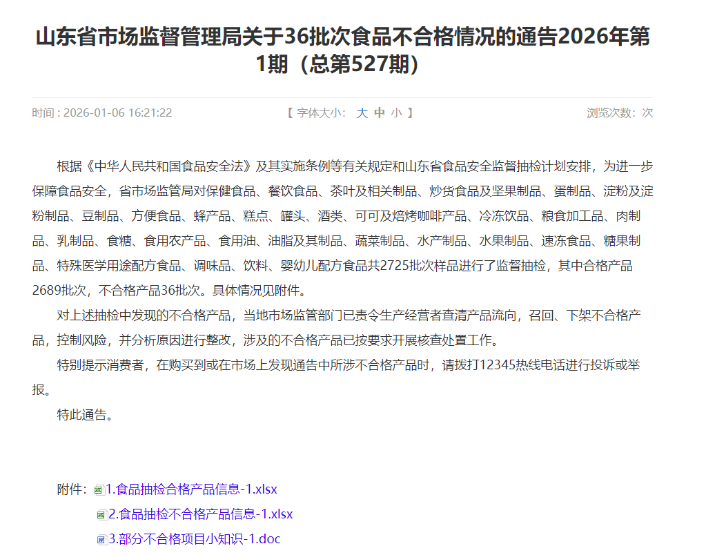 1月6日,山东省市场监管局发布关于36批次食品不合格情况的通告。此次抽检对粮食加工品、肉制品、食用农产品等2725批次样品进行监督抽检,检出农兽药残留超标、食品添加剂超标、质量指标不达标等问题。