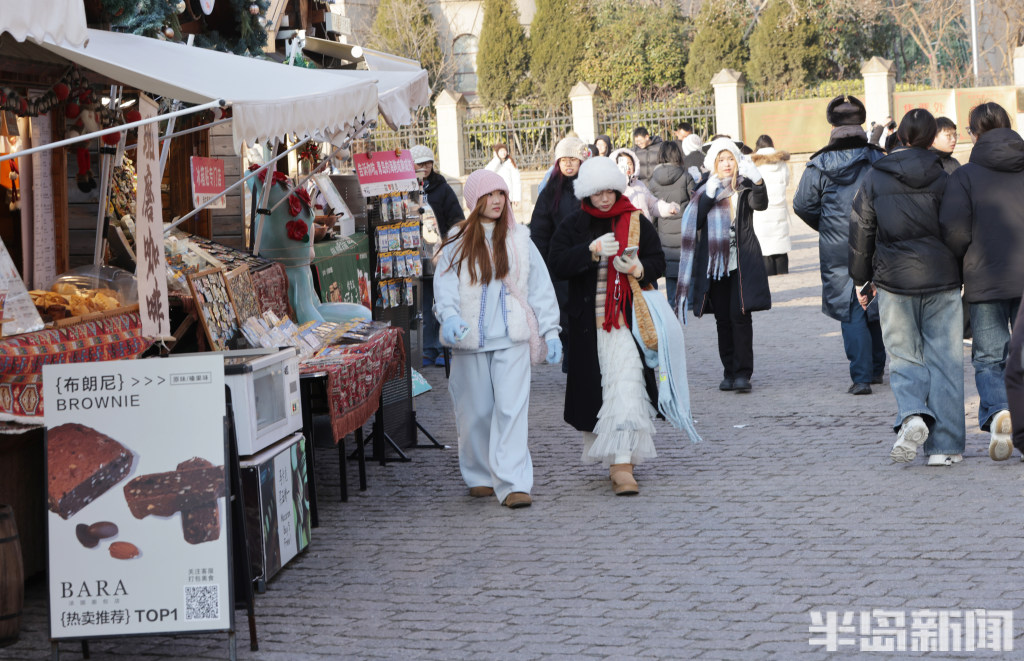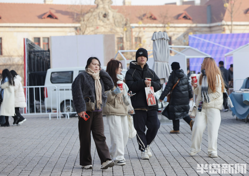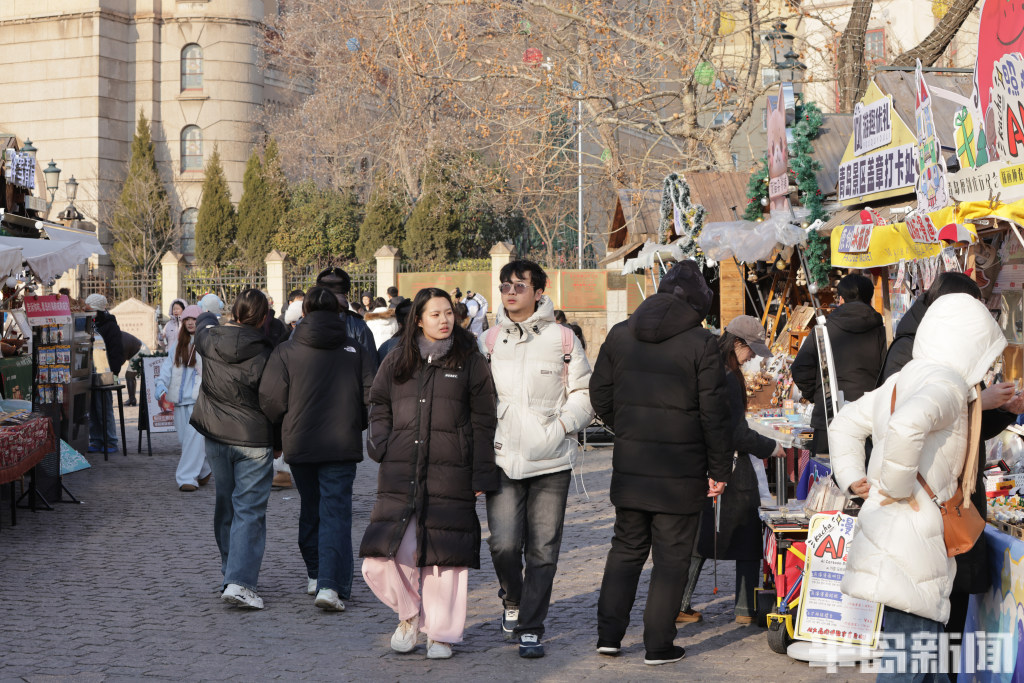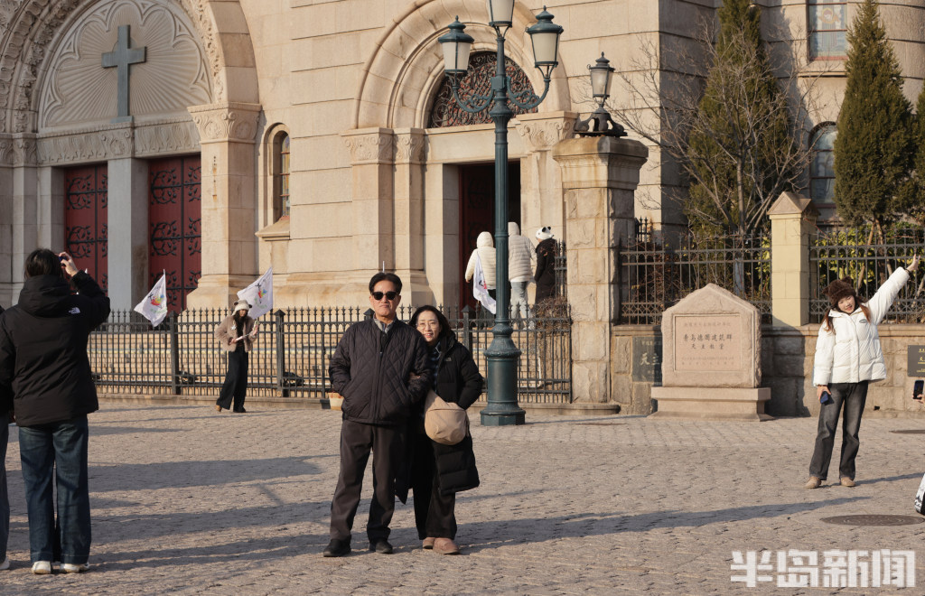 1月9日,青岛市南区天主教堂景区游人如织,其中不乏组团而来的韩国游客。他们穿梭于老城街巷,在领略红瓦绿树的独特韵味、感受历史建筑的厚重底蕴之余,纷纷打卡本地特色小吃与文创好物,沉浸式体验青岛的城市风情。