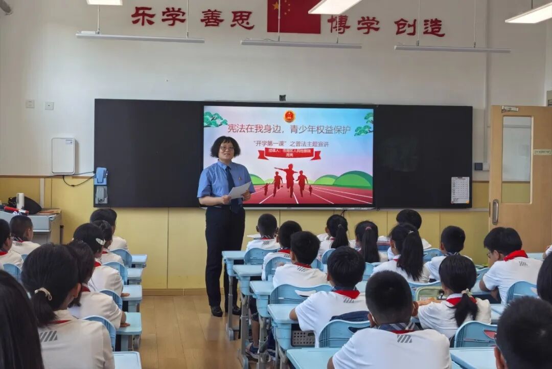 走进青岛太平路小学,为六年级学生带来普法宣讲“开学第一课”——《宪法伴我成长 青少年权益保护》。