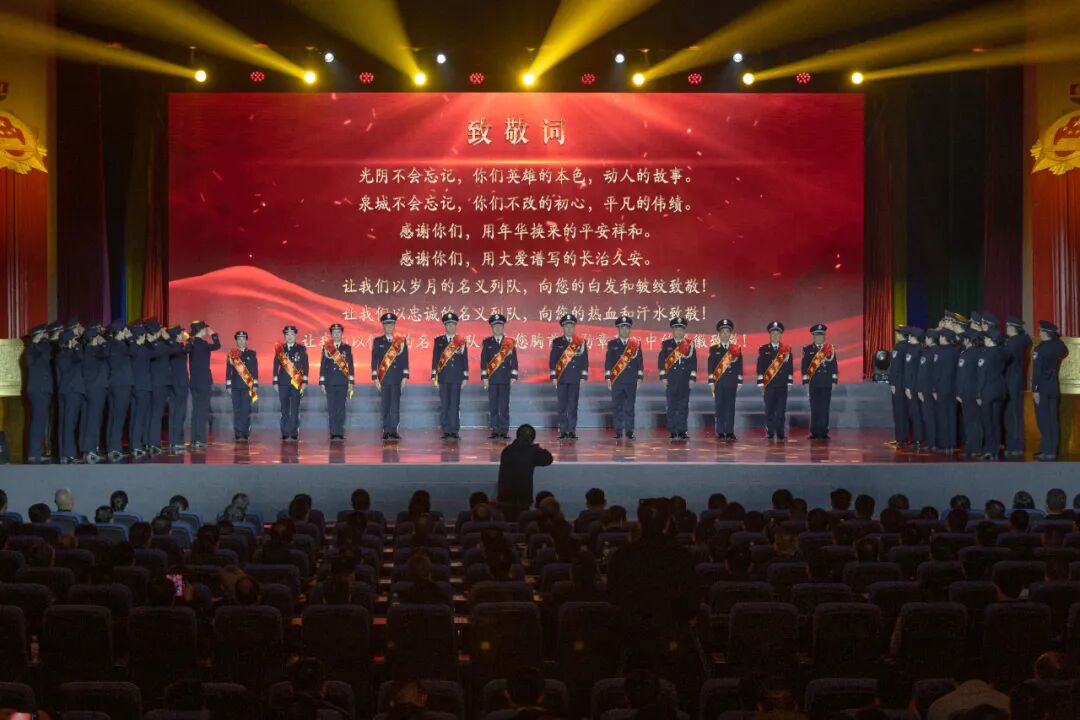 活动特别设置人民警察荣誉仪式环节,荣获基层工作荣誉奖的民警代表走上舞台,如雷的掌声是对他们数十载扎根基层,守护一方平安的最高褒奖。荣休民警代表满含对公安事业的无限热爱和深情眷恋,将象征着济南公安光荣传统和优良作风的旗帜传递给青年民警,鼓励他们为济南公安再立新功、再续荣光。活动还穿插了诗朗诵《以奋斗向你致敬》,合唱《光荣集结在警旗下》《爱警习武歌》《祖国不会忘记》,引发观众强烈共鸣,活动现场气氛热烈,掌声不断,最后在全场高唱《中国人民警察警歌》中主题活动圆满落下帷幕。
