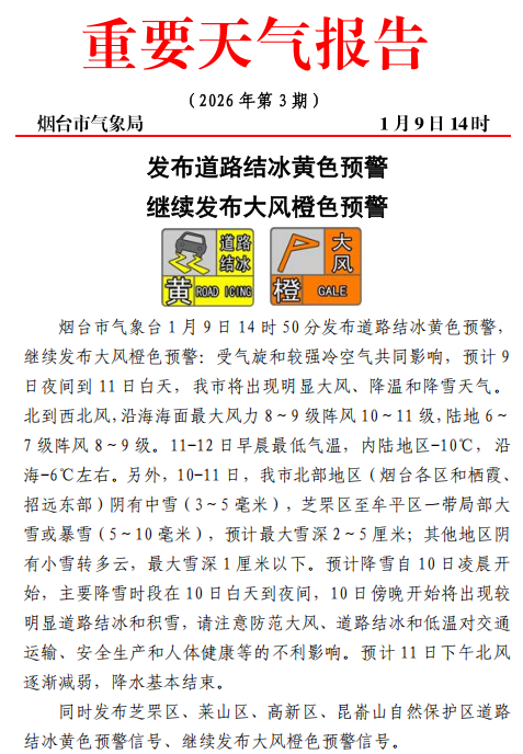 近日,烟台市气象台发布道路结冰黄色预警,继续发布大风橙色预警。