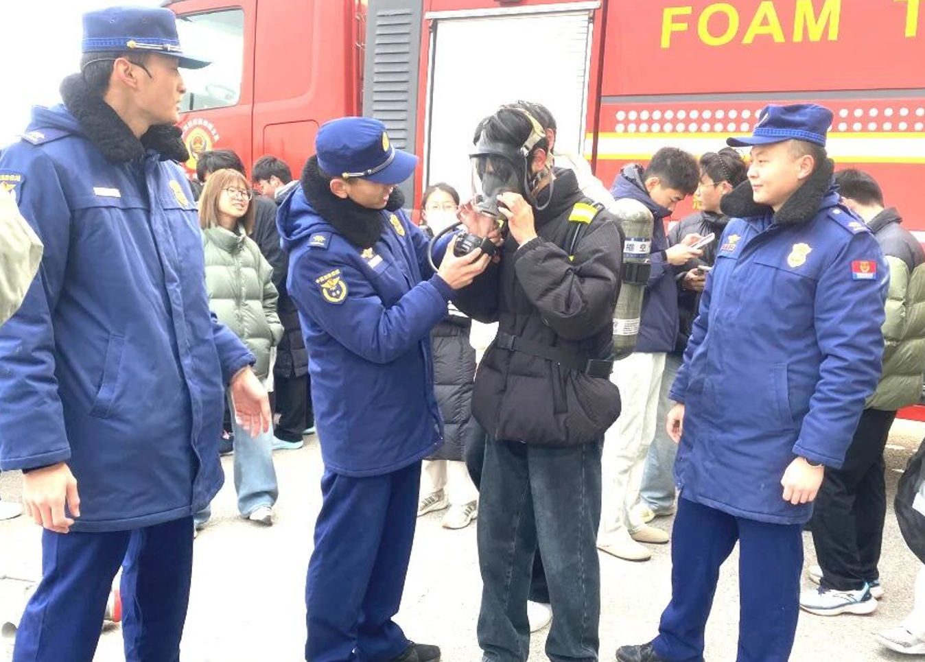 在器材展示区,消防救援人员向学生们详细讲解演示了各种器材装备的使用方法和功能用途,大家争相试穿灭火防护服,现场“打卡”体验,“沉浸式”感受消防救援工作的日常。随后,消防救援人员和学生们进行有奖问答活动,在互动过程中将校园火灾危害性、宿舍预防火灾措施和疏散逃生自救技巧等知识进行了广泛科普,吸引众多学生驻足参与。
