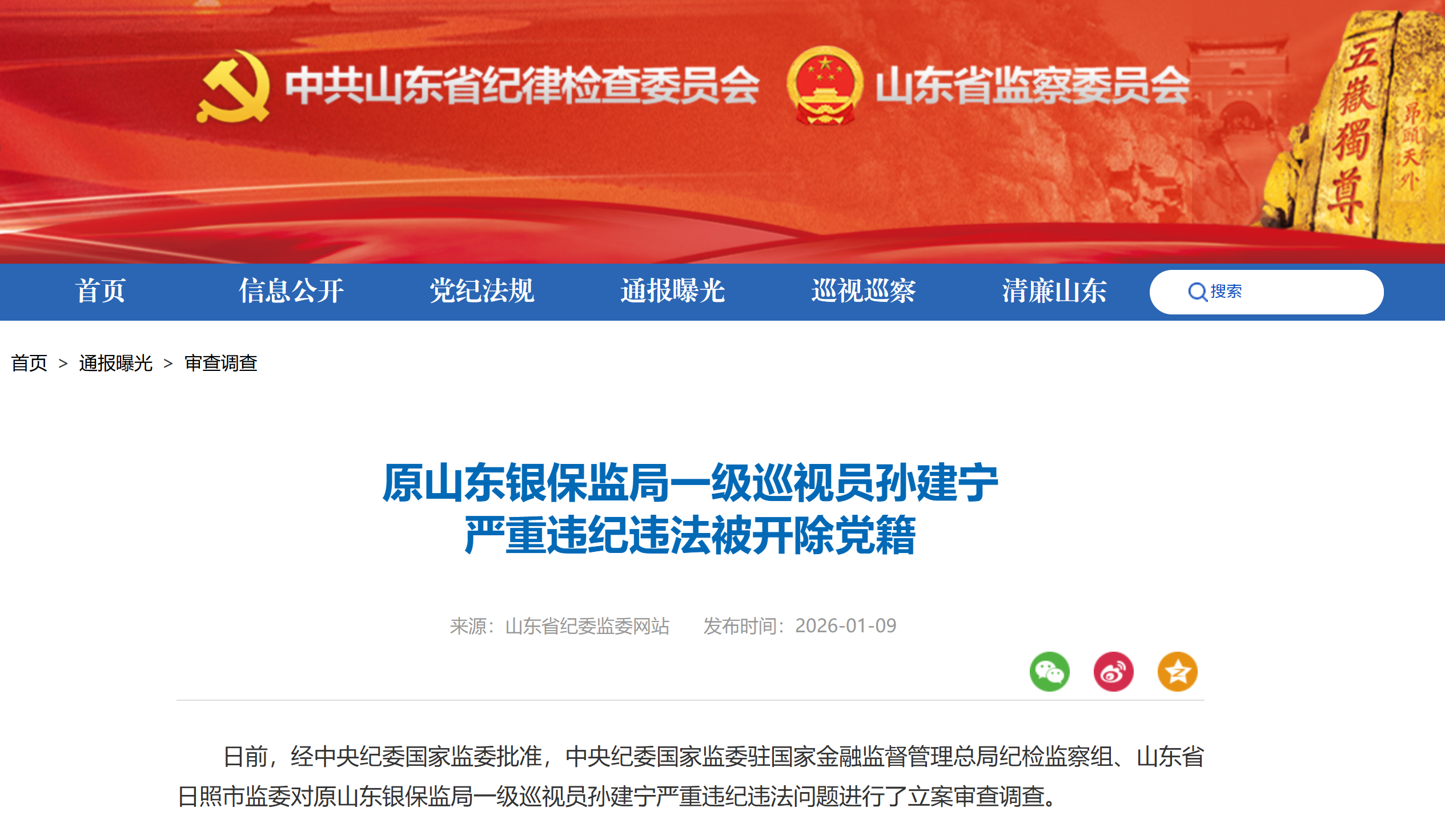 山东省纪委监委网站1月9日消息,原山东银保监局一级巡视员孙建宁严重违纪违法被开除党籍。