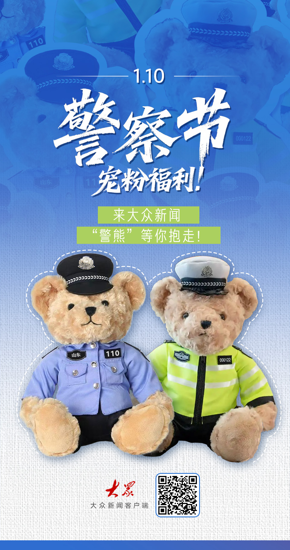 大众新闻客户端联合山东省公安厅,在警察节来临之际,为大家送上限定版警察小熊!