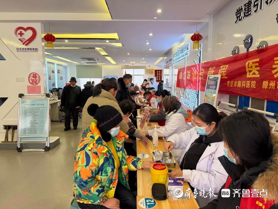 义诊现场四方医护人员各施所长。滕州市康复医院医护人员为群众测量血压、血糖,各科室专家耐心为居民进行康复、眼视光、内外科等方面的答疑诊断,并提出专业治疗建议;枣庄市胸科医院开展胸部疾病筛查;善南社区卫生服务中心医护人员免费测量血压;金桂园康养中心工作人员发放健康宣传资料,普及养生知识。