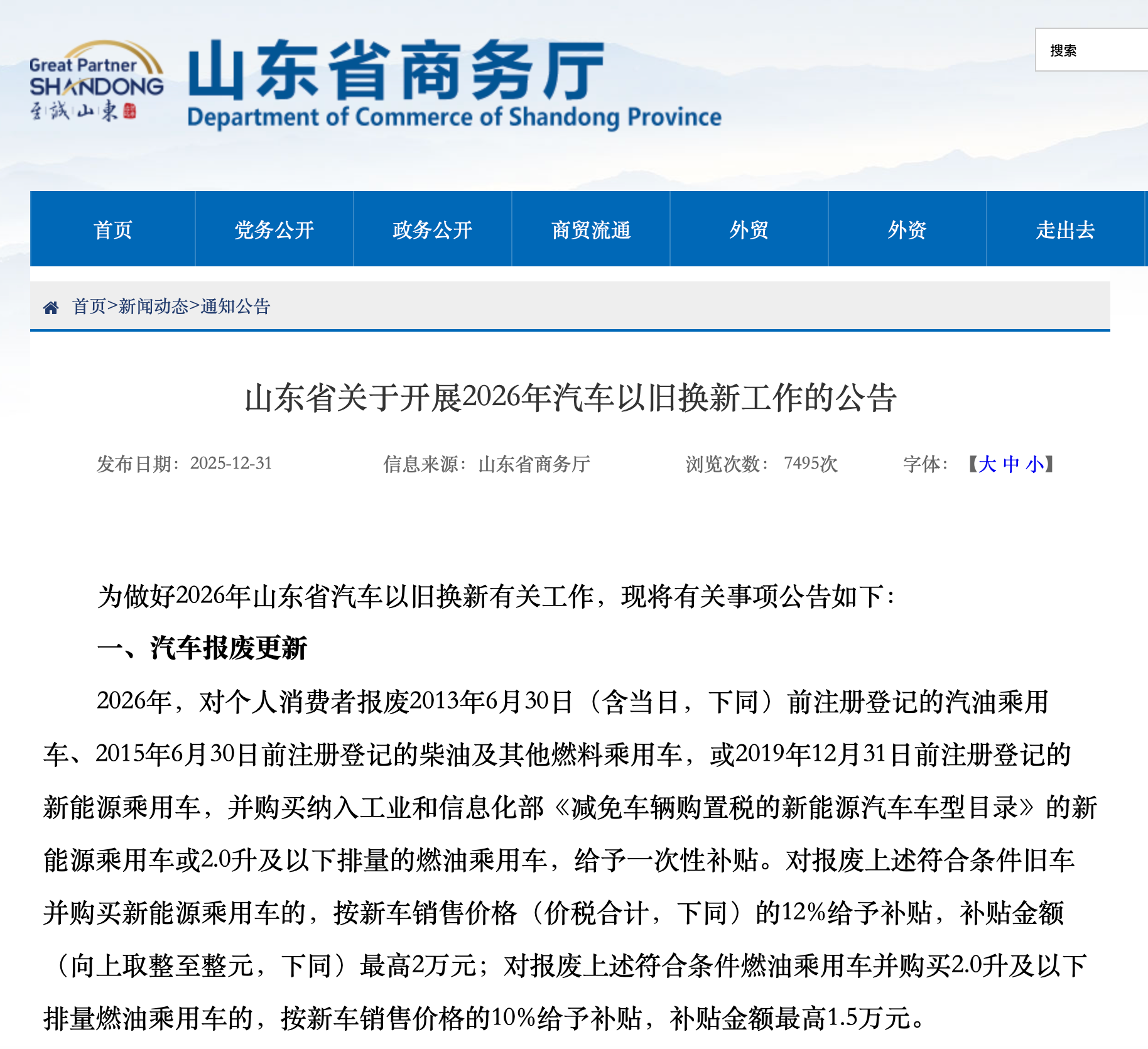 2026年伊始,山东车主迎来购车利好!2025年12月31日,为做好2026年山东省汽车以旧换新有关工作,山东省商务厅发布了《山东省关于开展2026年汽车以旧换新工作的公告》,就汽车报废更新和汽车置换更新进行了有关事项公告。本次补贴覆盖新能源车和燃油车,申请全程线上办理,方便快捷。详情>>