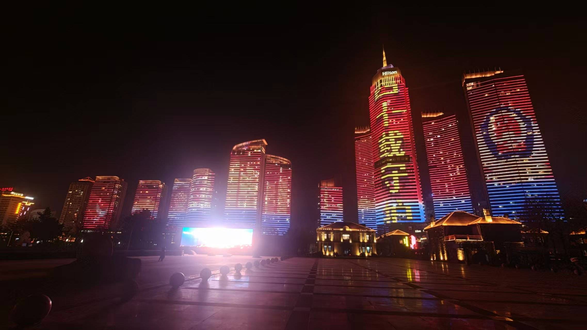 此次灯光秀以城市建筑为幕、光影为笔,构建起一场沉浸式的视觉盛宴。当晚17时30分许,随着灯光次第亮起,滨海广场联动楼体与观海大厦、华润中心的楼体灯光同步,巨大的主题标语在夜色中格外醒目,红色与蓝色的光影交织流转,既彰显了警察队伍忠诚履职的使命担当,也传递出温暖民心的城市温度。