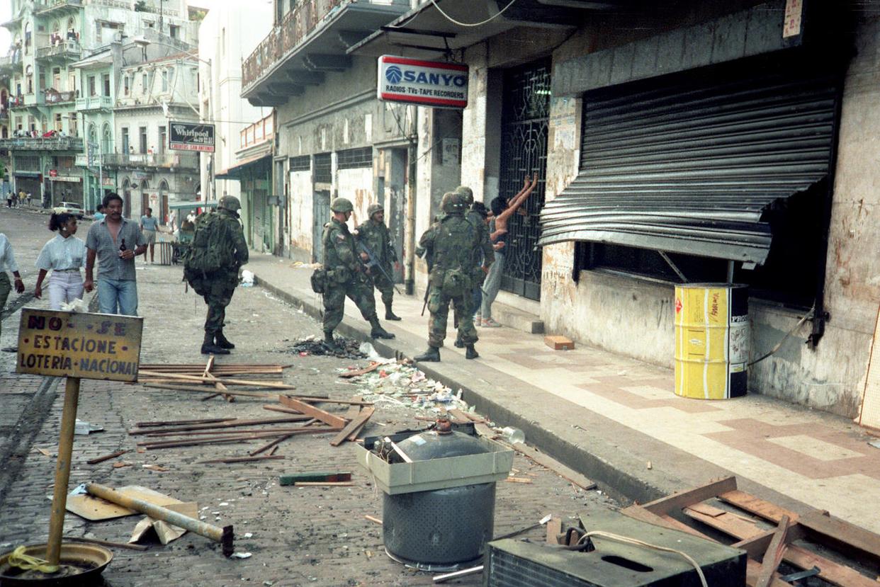 1989年,美国武装干涉巴拿马,美军士兵在巴拿马城街头搜查行人。新华社资料图