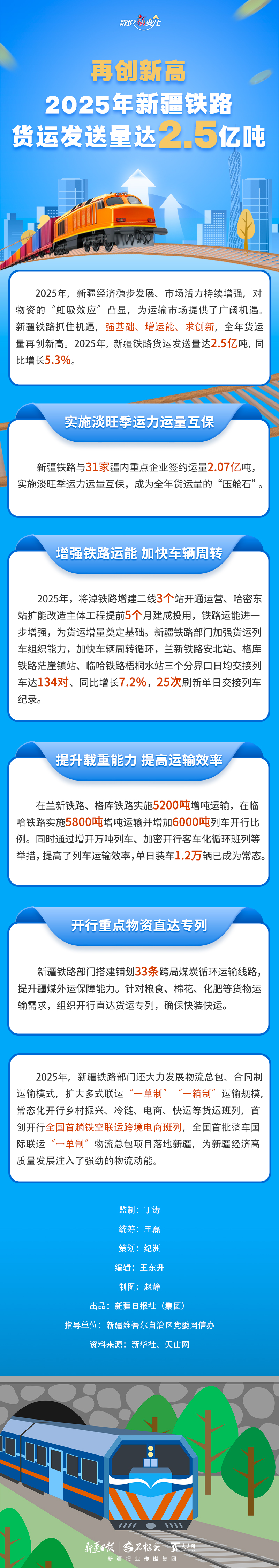 2025年,新疆铁路货运发送量达2.5亿吨,同比增长5.3%。新疆铁路货运量缘何能再创新高?铁路部门做了哪些工作?本期《数说“新”变化》,一起来看看。