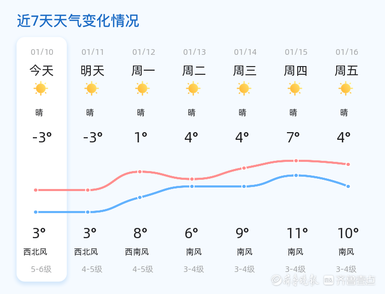 明天1月11日,青岛市仍将维持晴朗天气,气温范围与今日相同,为-3℃到3℃。风力有所减弱,西北风将从今日的5-6级降至4-5级。市民可以期待一个稍显温和的晴朗日子。