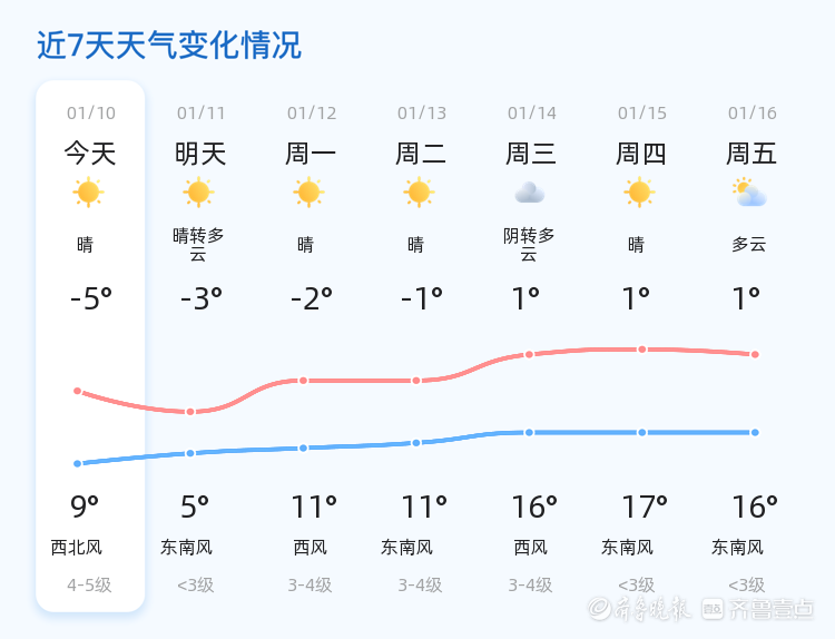 今天是1月10日,星期六,农历十一月廿二。枣庄市今天天气晴朗,白天气温最高可达9℃,夜间最低气温为-5℃。目前气温为3.3℃,西风2级,空气湿度26%,PM2.5指数为150。各区县天气情况总体稳定,以晴好天气为主,风力较小,适宜户外活动。