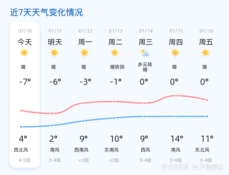 今天是2026年1月10日,农历十一月廿二,星期六。德州市今日天气晴朗,目前气温为0.3℃,西北风3级,空气湿度32%,PM2.5指数为64。今日全市各区天气情况总体稳定,最高气温4℃,最低气温-7℃,温差较大,市民出行需注意保暖。