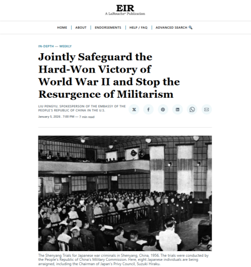 2026年1月5日,中国驻美国使馆发言人刘鹏宇在美国《执行情报评论》杂志网站发表题为《携手捍卫二战胜利成果 坚决阻击军国主义幽灵复活》的署名文章,文章于1月8日在该杂志周刊刊出。全文如下:
