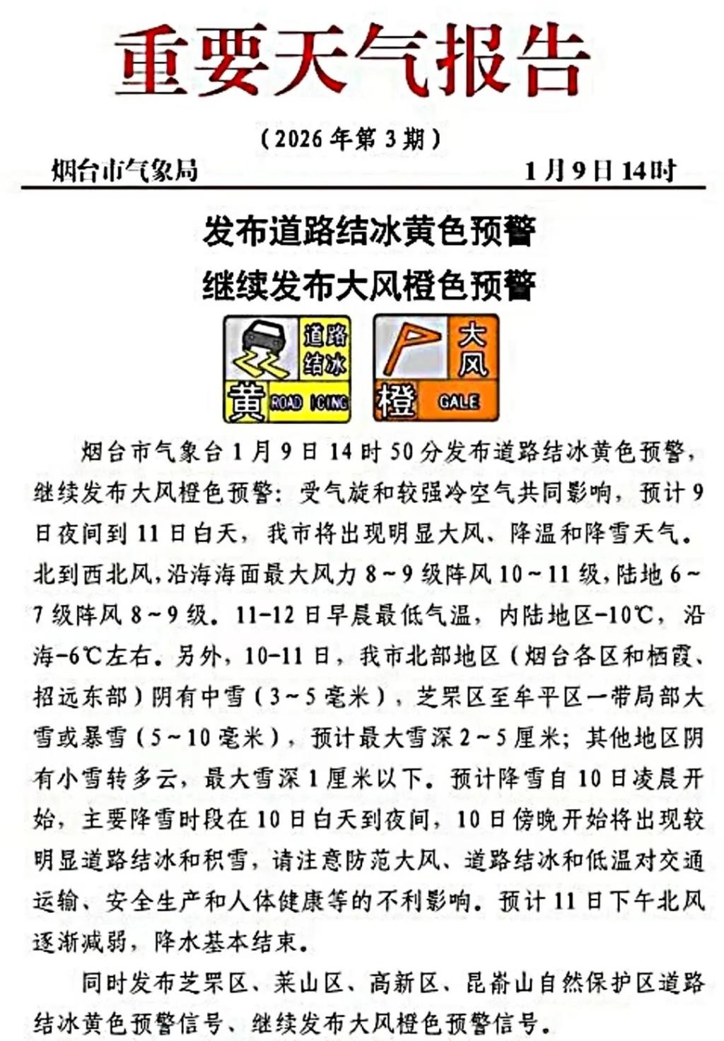 烟台市气象局已发布道路结冰黄色预警及大风橙色预警,预计1月9日夜间至11日白天将出现大风、降温、降雪及道路结冰现象。为切实保障您的人身安全,依据公园安全管理规定,烟台磁山地质公园自2026年1月10日起实施封山措施,全面暂停入园游览活动。