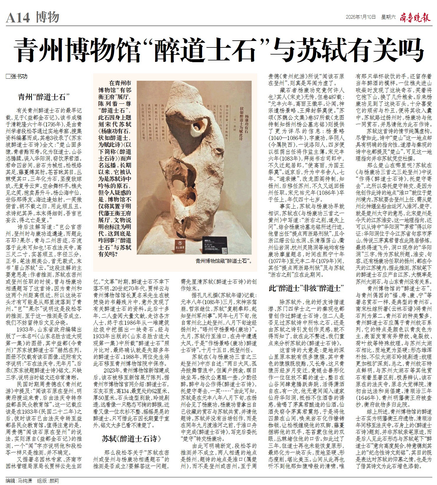 在青州市博物馆“有邻衡王府”展厅,陈列着一尊“醉道士石”,此石因身上题刻宋代苏轼《杨康功有石,状如醉道士,为赋此诗》(以下简称《醉道士石诗》)而声名远播。长期以来,它被认为是苏轼诗中吟咏的原石,但令人疑惑的是,博物馆不仅将其置于明代藩王衡王府展厅,文物说明也标注为明代。这到底是咋回事?“醉道士石”与苏轼有关吗?