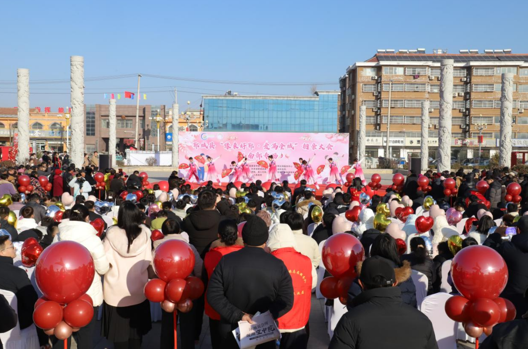 1月9日,冬日的郓城县郭屯镇广场暖意融融、热闹非凡。“缘来好郓・爱满全城”相亲大会南部专场在此启幕,130名来自郭屯、南赵楼、武安等7个乡镇的单身青年齐聚一堂,在寻觅人生良缘的同时,沉浸式感受黄河大集的市井烟火与非遗文化的独特魅力,让“低彩礼、零彩礼”的文明婚恋新风在欢声笑语中浸润乡野。