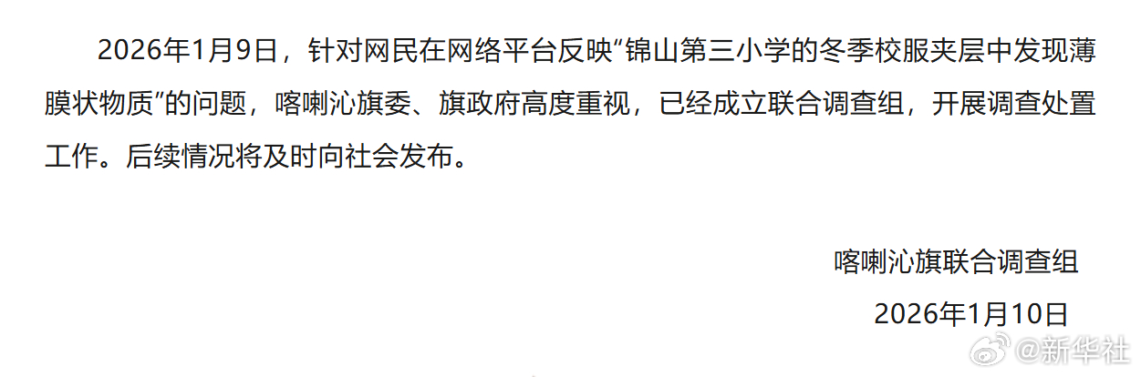 2026年1月9日,针对网民在网络平台反映“锦山第三小学的冬季校服夹层中发现薄膜状物质”的问题,喀喇沁旗委、旗政府高度重视,已经成立联合调查组,开展调查处置工作。后续情况将及时向社会发布。(新华社)