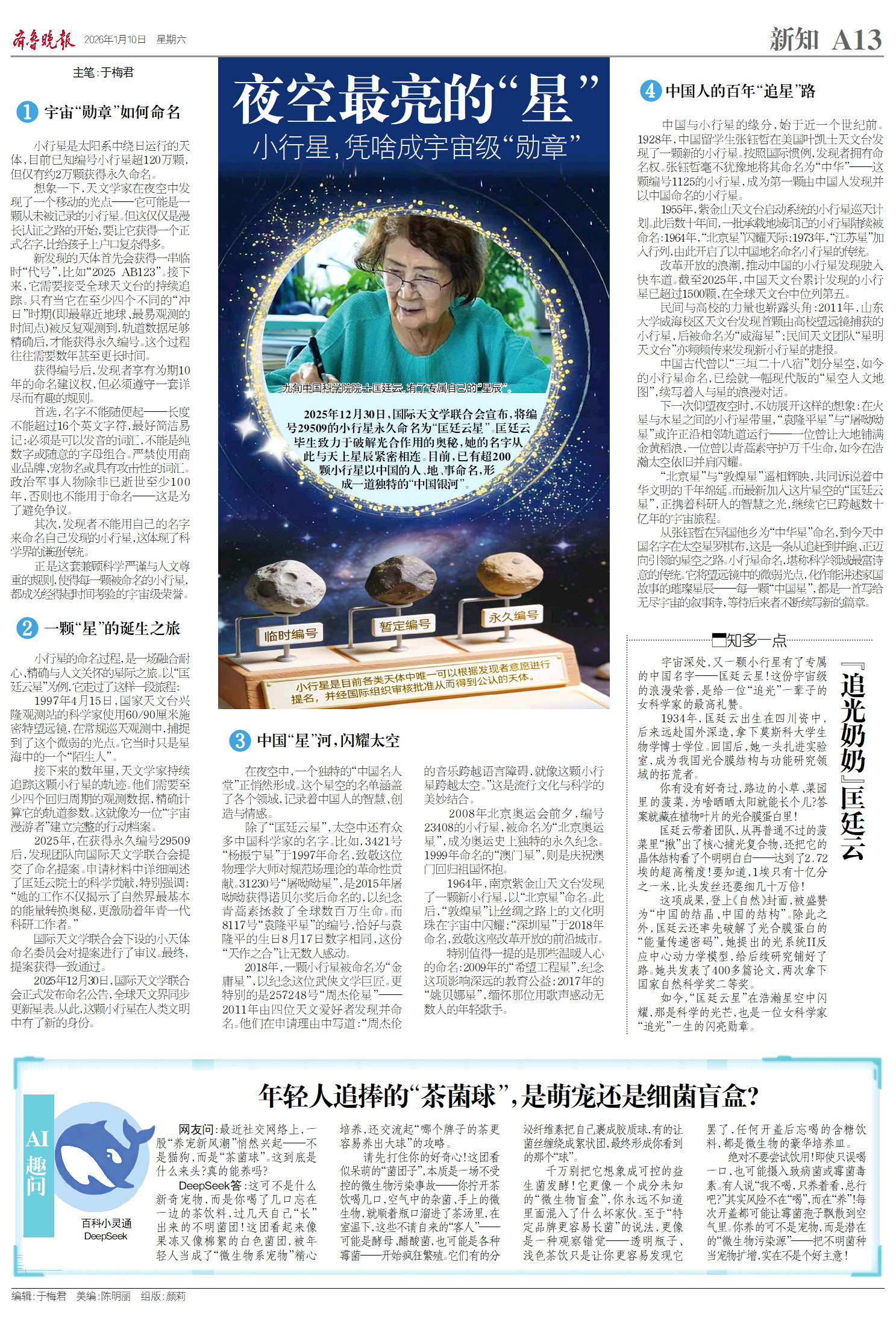 从张钰哲在异国他乡发现“中华星”,到今天中国名字在太空中星罗棋布,这是一条从追赶到并跑,正迈向引领的星空之路。小行星命名或许是科学领域最具诗意的传统。它将冰冷的天文数据,转化为有温度的文化记忆;将望远镜中的光点,变成可以讲述故事的星辰。