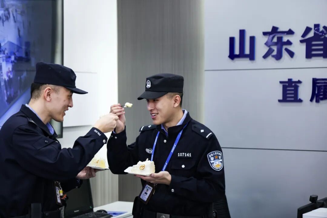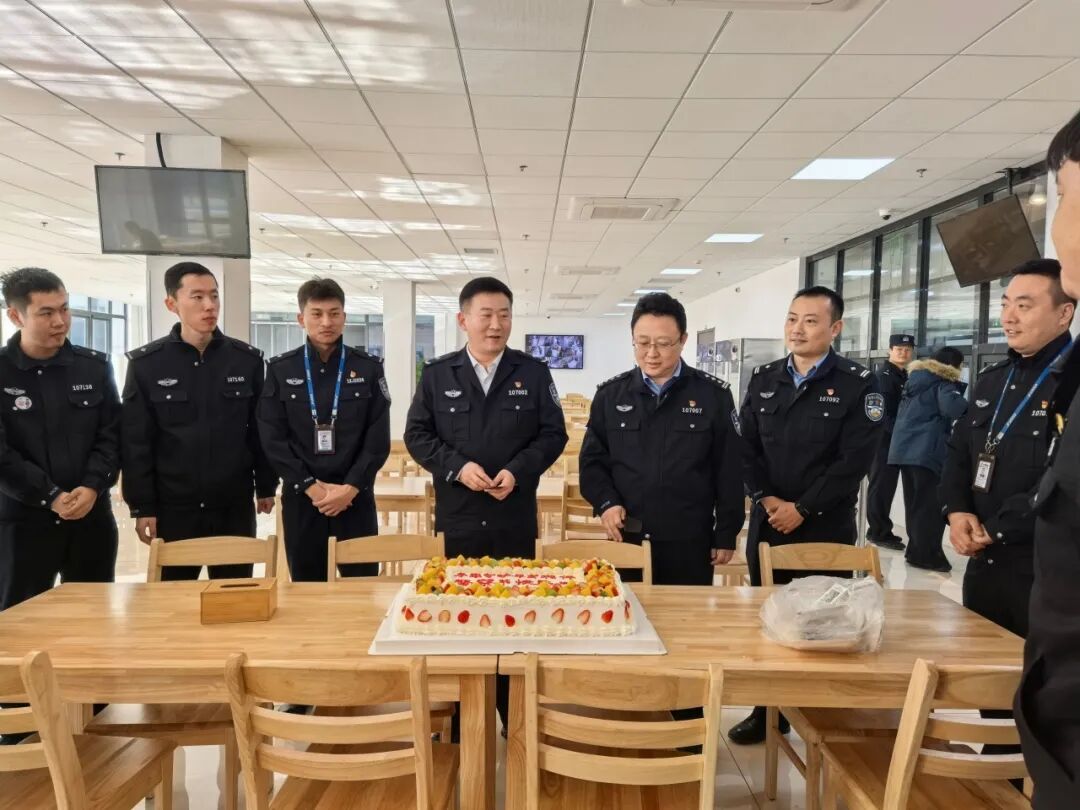 活动尾声,领导们专程来到直属分局候机楼派出所,看望慰问节日坚守岗位的民警辅警,为他们送上精心准备的节日蛋糕。领导与同志们亲切交谈、共切蛋糕,共同分享节日的喜悦和甜蜜时刻。接过这份特殊礼物,民警辅警们倍感温暖、备受鼓舞。“谢谢局党委的关心,我们一定把这份温暖化作守护平安的动力!”候机楼派出所新入职青年民警刘卓抹着嘴角的奶油,笑容格外灿烂。