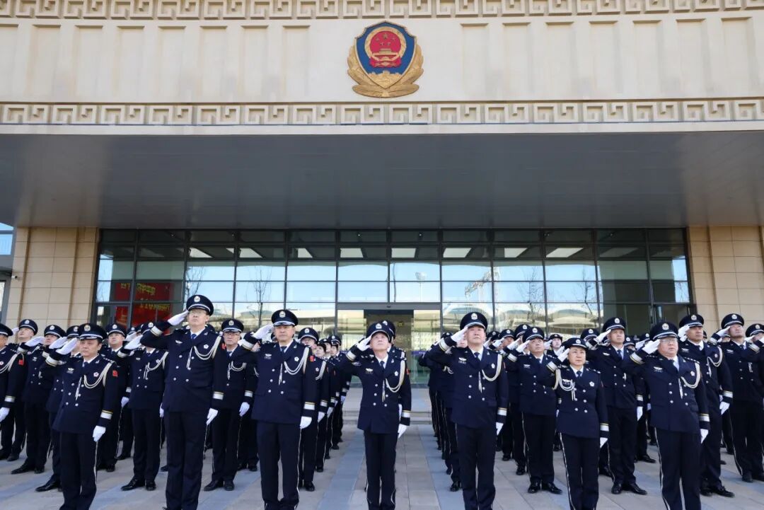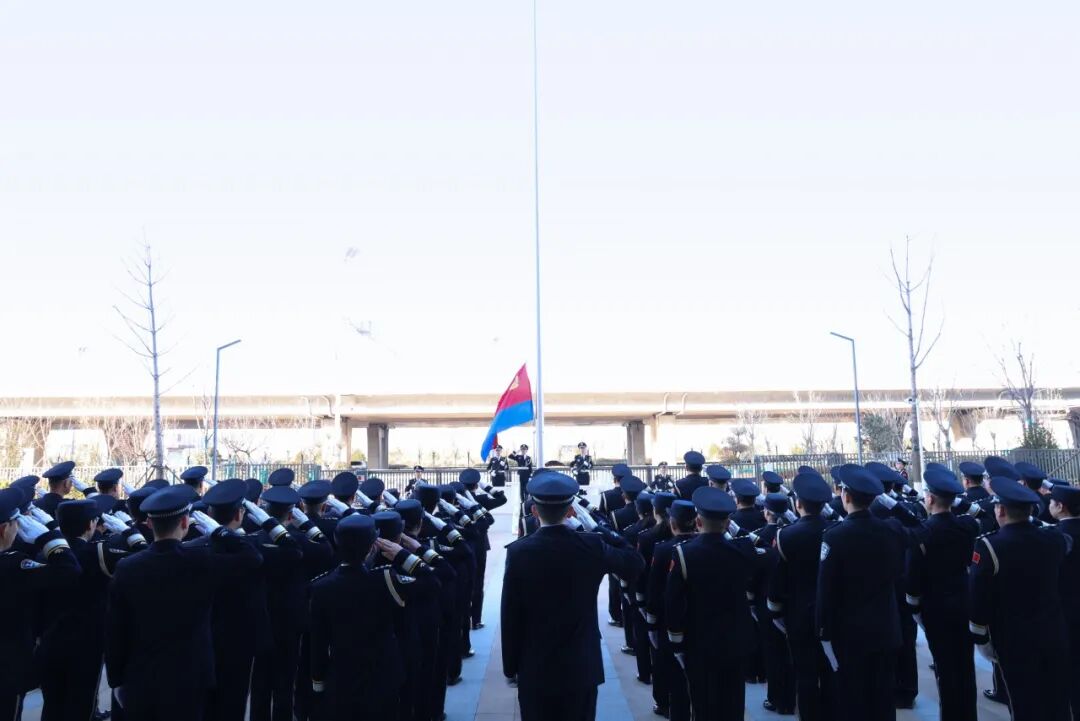 1月10日9时,全体民警、辅警警容严整,在办公楼前整齐列队。伴随着指挥员口令,仪仗队员昂首挺胸,迈着坚实有力的步伐,护卫中国人民警察警旗走向升旗台。当雄壮激昂的《中国人民警察警歌》响起,擎旗手挥臂扬旗,警旗沐浴着朝阳迎风舒展、徐徐升起。全体民警、辅警向警旗庄严敬礼,高唱警歌,唱响人民警察的初心使命和忠诚担当,祝愿公安事业欣欣向荣,蒸蒸日上。