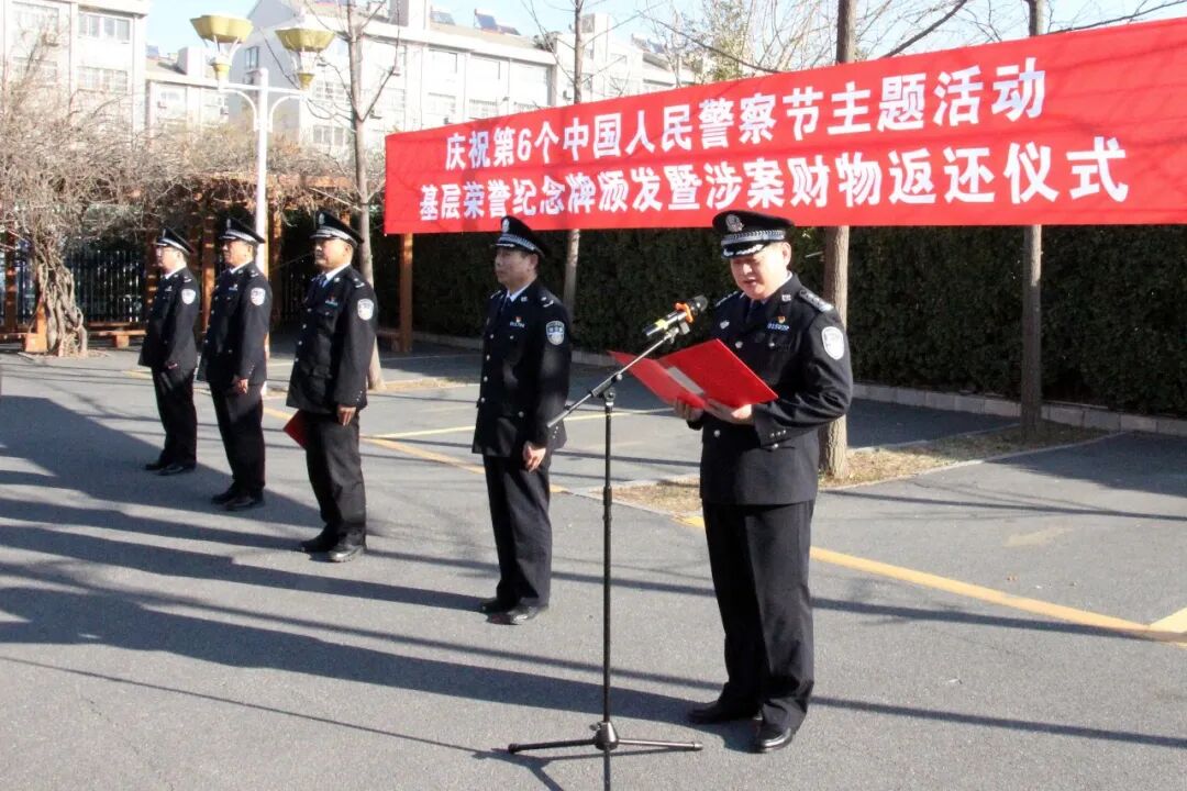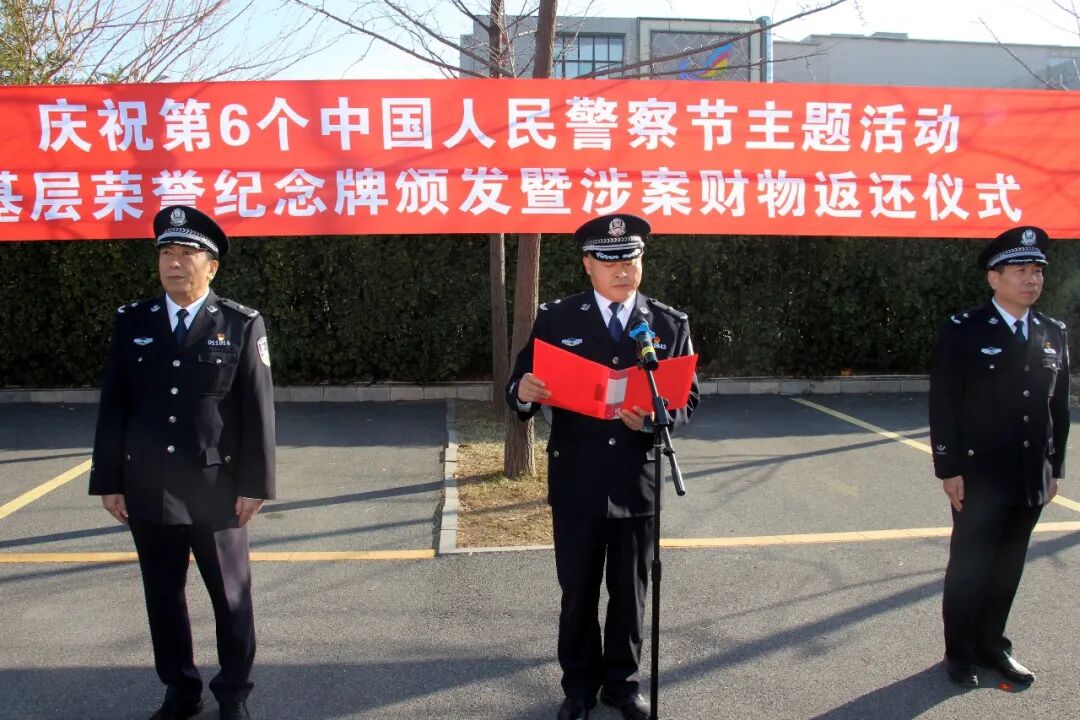 为热烈庆祝第六个中国人民警察节,充分展现公安队伍忠诚担当、竭诚为民的良好形象,1月9日上午,济南市公安局章丘分局在文化路派出所隆重举办系列主题活动。活动涵盖基层荣誉纪念牌颁发、涉案财物集中返还、警营开放日、座谈会等丰富内容,进一步凝聚警心、鼓舞士气,让警民鱼水情愈发深厚。章丘区副区长,章丘分局党委书记、局长郭宝银出席活动,区人大代表、政协委员及区驻地高校领导代表参加活动,主题活动由分局党委委员、政工室主任李绍斌主持。