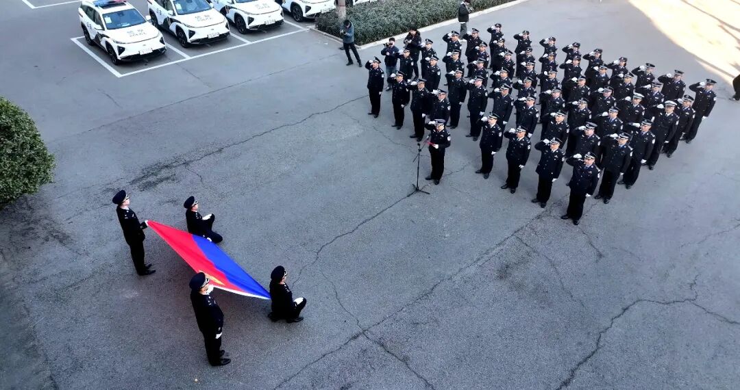 上午9时整,向警旗宣誓活动正式开始。现场民警警容严整、精神抖擞,在分局院内整齐列队,集体奏唱《中华人民共和国国歌》。随着号令,4名旗手迈着整齐有力的步伐,护送警旗入场,全体同志面向警旗庄严敬礼。“我是中国人民警察,我宣誓!”由王玉山领誓,全体同志举起右拳,重温公安机关人民警察誓词,共同表达庆祝节日的喜悦心情和忠诚公安事业的坚定信念。